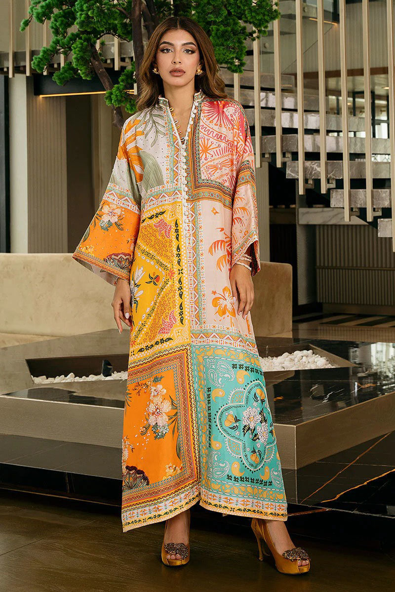 A luxurious silk shirt that's a true work of art in blues, rust, pink, and multi colors. The shirt features a unique design with various prints arranged in stylish blocks, creating a captivating visual statement. The prints are carefully curated, showcasing a blend of trendy patterns that effortlessly flow together. The multicolored sequences scattered across the fabric and fabric buttons add a touch of playful elegance, catching the light as you move. This shirt embodies an easy-breezy, laid-back vibe while making a bold fashion statement, making it an ideal choice for those who appreciate a fusion of comfort and curated style.
