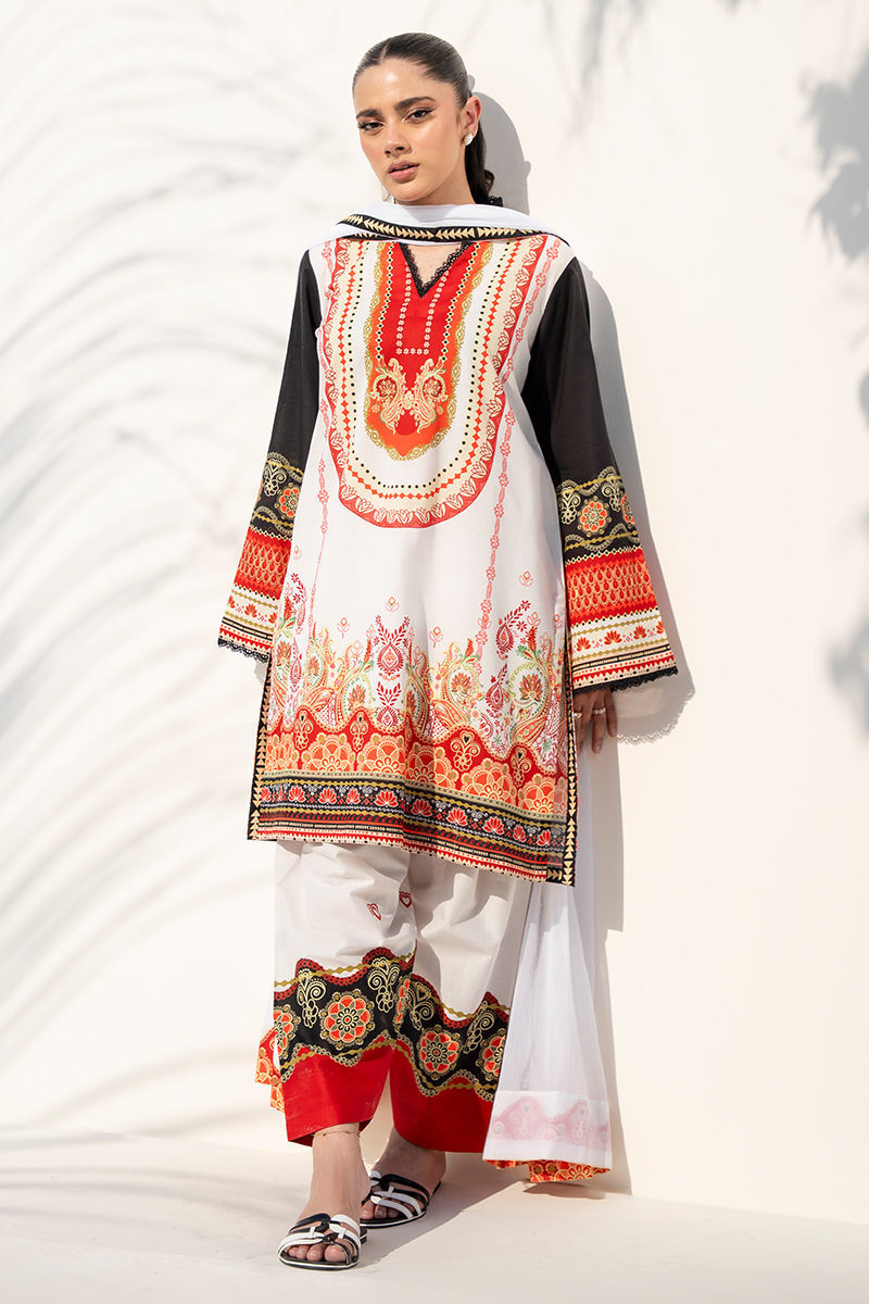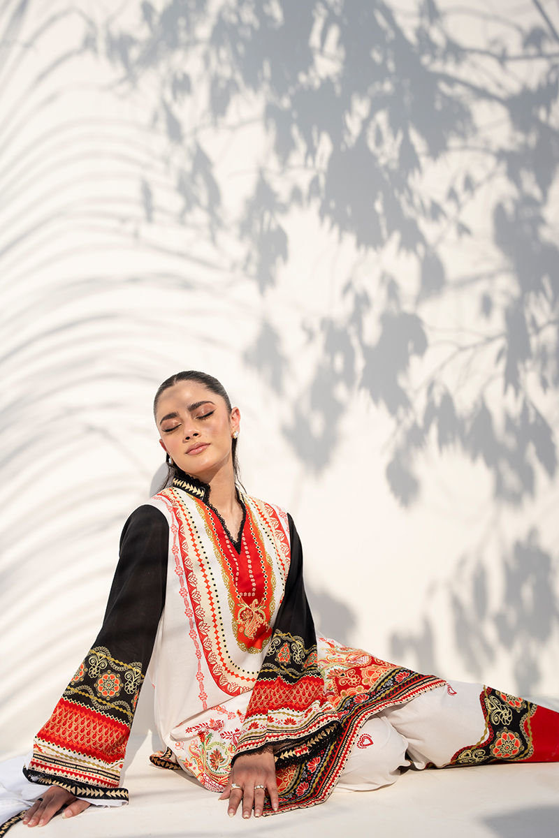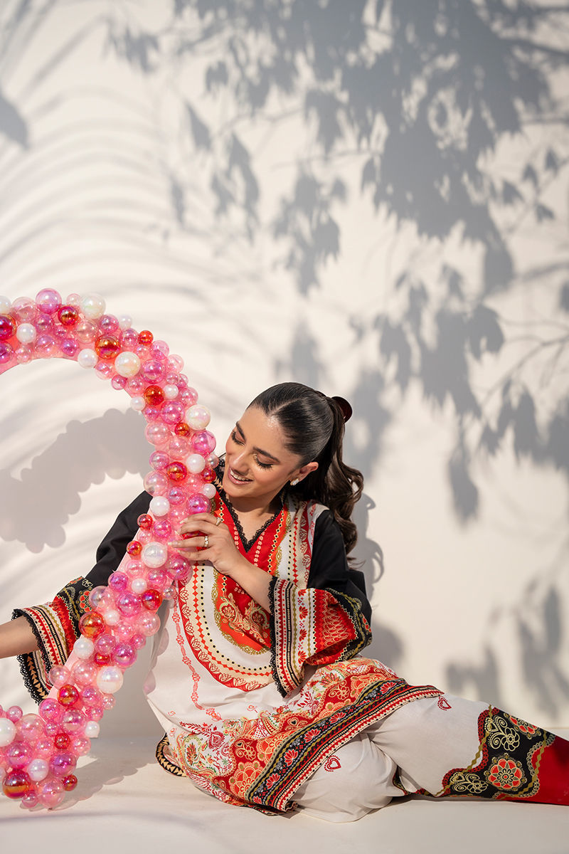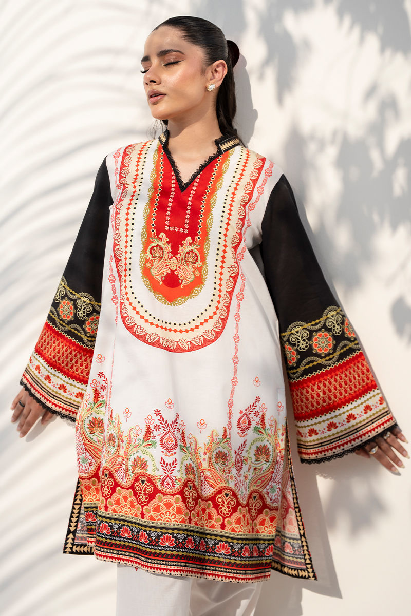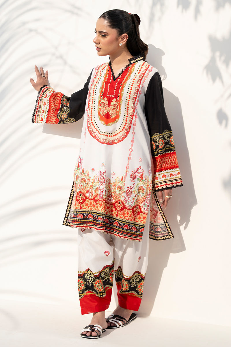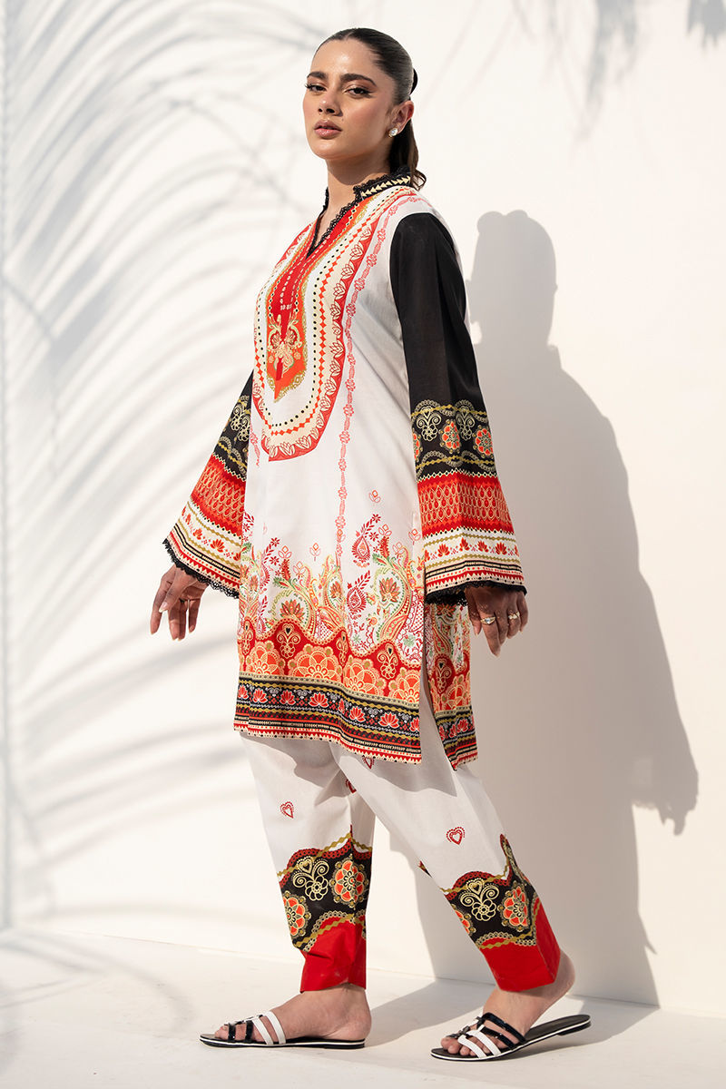 Bold yet refined, this cambric lawn ensemble features a striking ivory, black, and red colour-block printed short kurta paired with a classic shalwar. The contemporary play of contrasting hues creates a statement look while maintaining an elegant balance. Tailored for comfort in breathable cambric lawn, the silhouette is both effortless and polished. Paired with an off-white dupatta as an add-on, this ensemble brings a soft, graceful finish — perfect for chic daytime wear or relaxed gatherings. SHIRT LENGTH: 36"