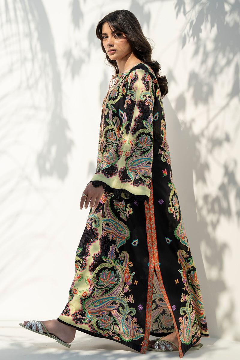 Graceful and effortlessly chic, this black cambric lawn kurta is designed in a flowing kaftan cut that offers both comfort and style. The deep black base is beautifully brought to life with vibrant pops of yellow, orange, and green in an eye-catching print, adding a lively yet elegant appeal. The neckline is adorned with delicate tassel detailing, lending a soft handcrafted charm, while intricate cutwork lace on the sleeves adds a refined and feminine finish. Perfect for easy daytime wear or relaxed festive gatherings, this piece blends comfort with understated sophistication. SHIRT LENGTH: 53"