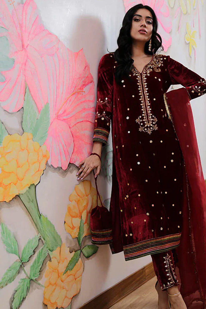 A flattering neckline crafted in gota and traditional gold handwork, it is completed with edging in deep winter tones! Paired with an organza dupatta which is sprinkled with gota and finished with intricate detailing.* Please note the price of the silk fabric option includes the complete outfit.Shirt: VelvetDupatta: Velvet