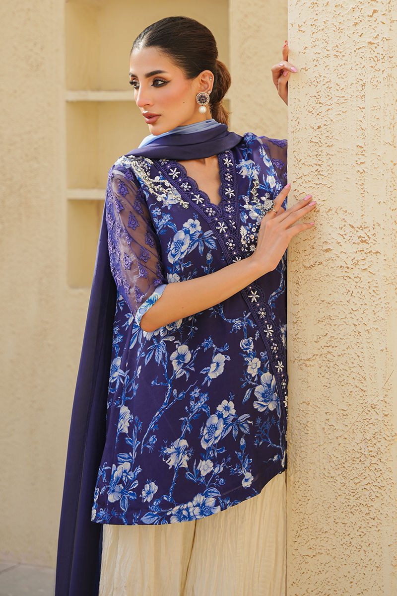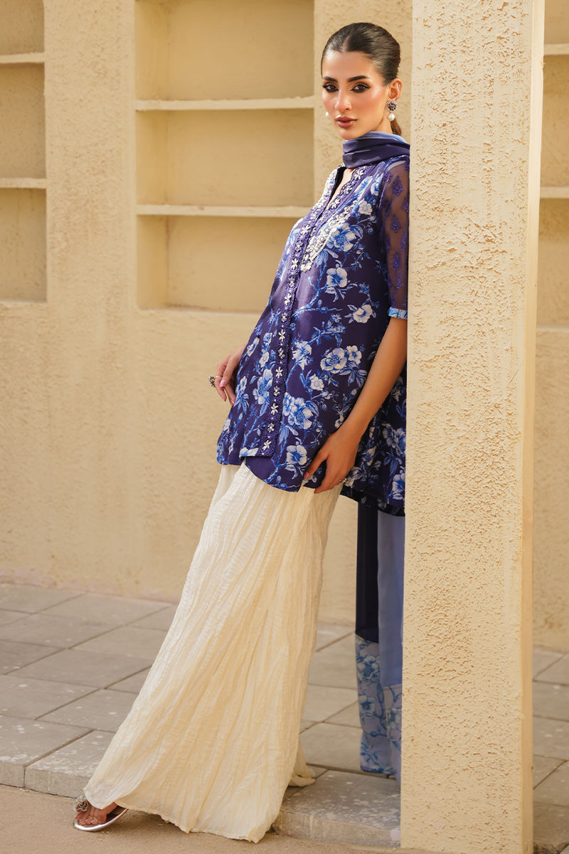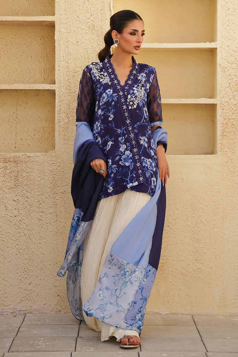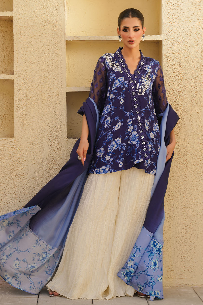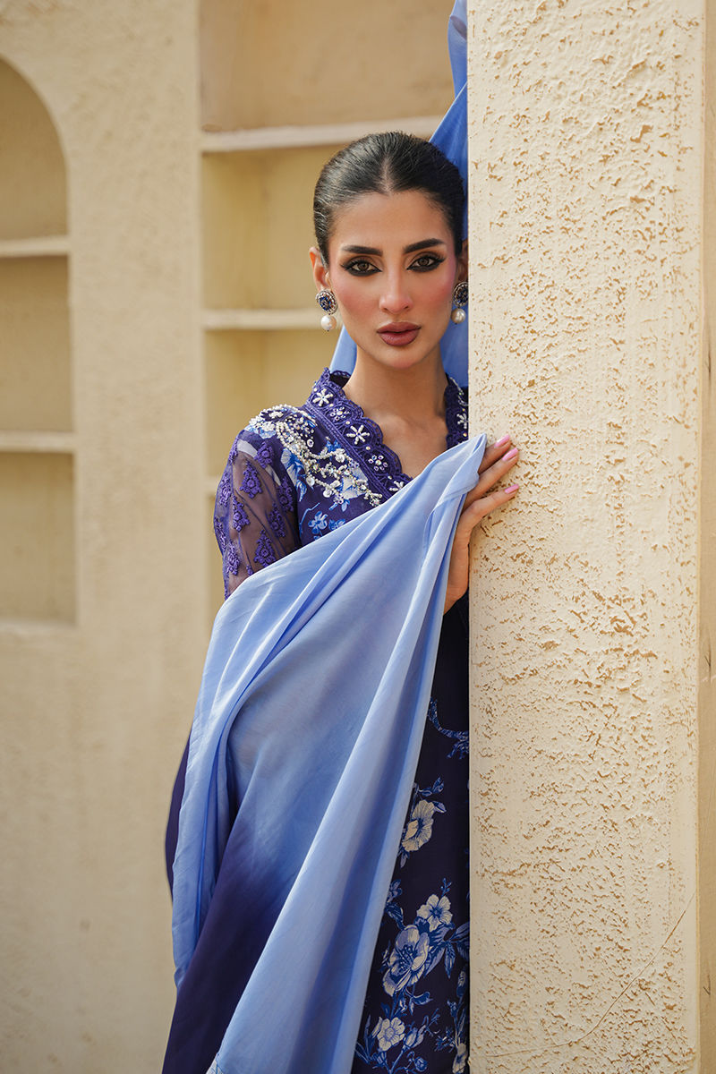 A serene blue silk A-line shirt featuring a refined repeat floral print, designed with an elegant, flowing silhouette. The piece is delicately enhanced with hand embroidery using pearls, crystals, and stones, adding a subtle shimmer and artisanal richness to the overall design. Paired with a two-tone dupatta featuring printed elements on the pallus, the ensemble carries a graceful blend of texture and color. A cotton-silk crushed dhaka is offered as an add-on, completing the look with soft volume and effortless traditional charm.