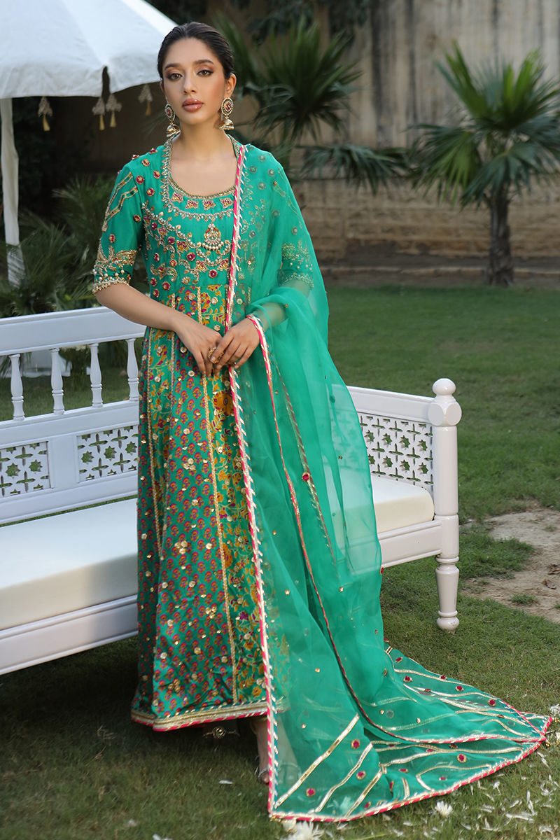 Festive season has never been better a fully worked discharge printed kalidar in a striking tone of green with vibrant resham and print detailing. The classic elbow length bodice is fully handworked with intricate gota Zardozi and French knots. Our back and front neckline details are perfectly fused between modern and traditional for our today’s brides and bride’s maids who love to carry classics with grace. Pure organza duppata is detailed perfectly for the festive season. Shirt: Raw Silk Dupatta: Organza Pant: Raw Silk