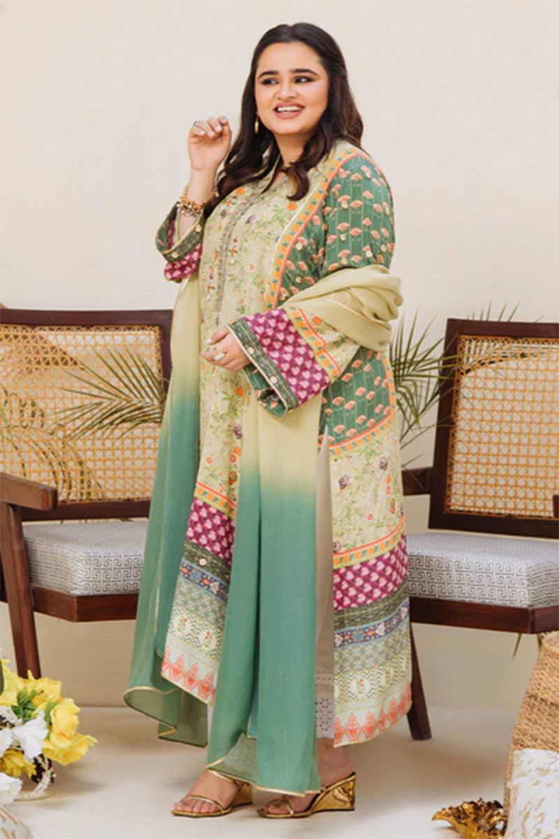 Wear your greens this season with this in-house printed green pure crepe silk shirt with Gota detailings and hand-worked buttons on the neckline. A stunning two-toned tissue silk dupatta and the shirt is finished off with kingri Gota making it perfect for upcoming Eid dinners or summer dholkis. Pair it up with off-white pants done with multiple laces.Shirt: Pure Crepe SilkDupatta: Pure Crepe Silk