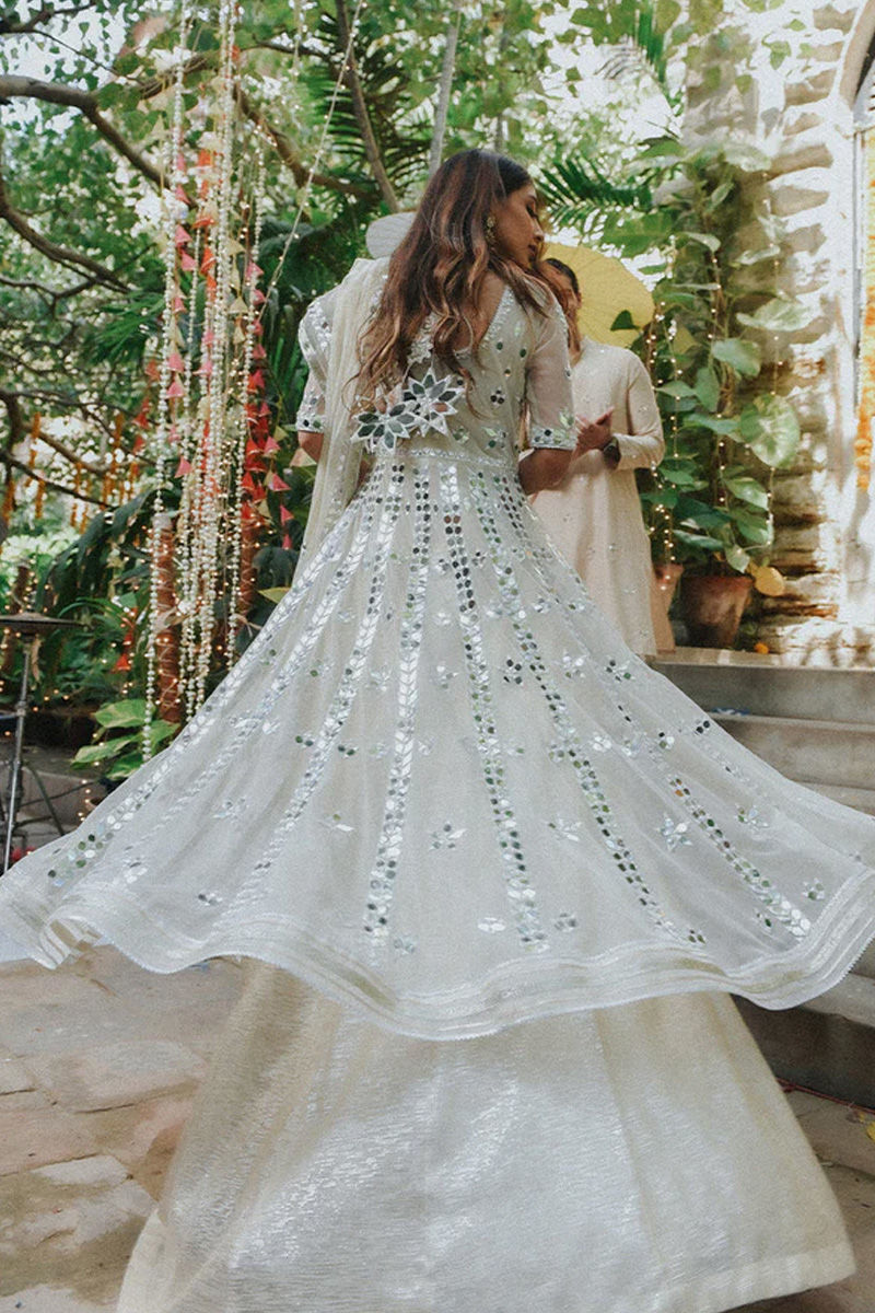 You all know our love for ivory! Sheesha and ivory is all ticks for a perfect festive oufit! A fully worked resham and sheesha front open kalidar, wear it to a nikkah or dazzle on a mehndi dance floor! The double necked bodice makes this kalidar absolutely body flattering! We love the elbow lenght sleeves and the mirror phool statement tassel, the duppata is fully worked with 4 sided borders and booties, making it a perfect outfit for a nikkah bride! We have paired it up with an ivory shimmer lengha to make it more blingy and festive! Get a Customized name potli pouch with your name or dulha’s name. Shirt: Resham Dupatta: Resham