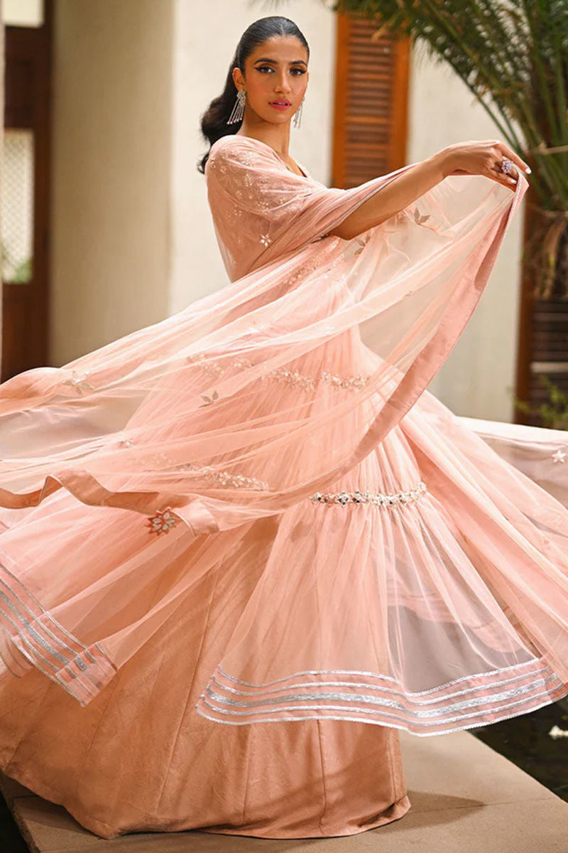 The blush pink net front-open shirt features delicate gathers and mirror detailing, creating an enchanting effect. The self-anchor embroidery and mirror-worked bodice add a touch of intricacy and elegance. The outfit is beautifully finished with silver kingri and Gota accents. Complementing the shirt is a self-jamawar lehnga, enhancing the overall look. The fully mirror-worked net dupatta with tassels adds a graceful flow and movement to the ensemble. This ensemble is a perfect choice for all your festive needs as it combines modern elements with traditional aesthetics, resulting in a charming and memorable look. Shirt: Net Dupatta: Net Pant: Net