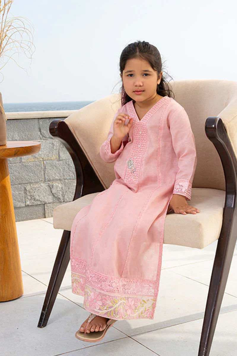 say yes to more pink…. Ubercute pink minime shirt with statement handwork buttons, lace detailings and embrioideries on daaman and sleeves. Cute bows and dainty jewellery is all you need to doll up your little one.Shirt: In-House EmbossedPant: In-House Embossed