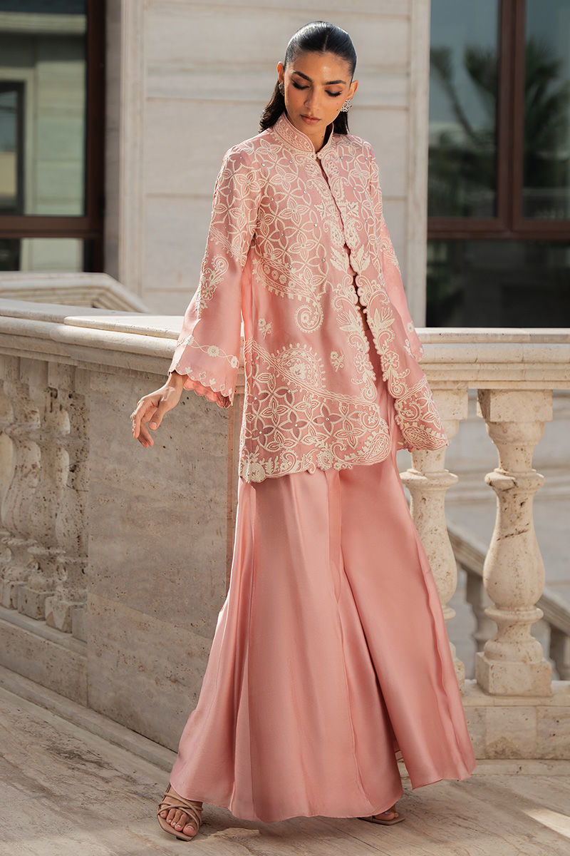 A beautiful pink sheesha silk jacket, intricately adorned with fine aari embroidery, delicate cutwork detailing, and subtle Swarovski crystal embellishments for a luminous touch. Layered over a matching sheesha silk slip and paired with a graceful dhaka, this ensemble blends traditional craftsmanship with refined elegance. Eid styling tip: elevate the look with statement chandbalis, a sleek low bun, and soft rosy makeup for a festive yet graceful finish. Model is wearing 32" length