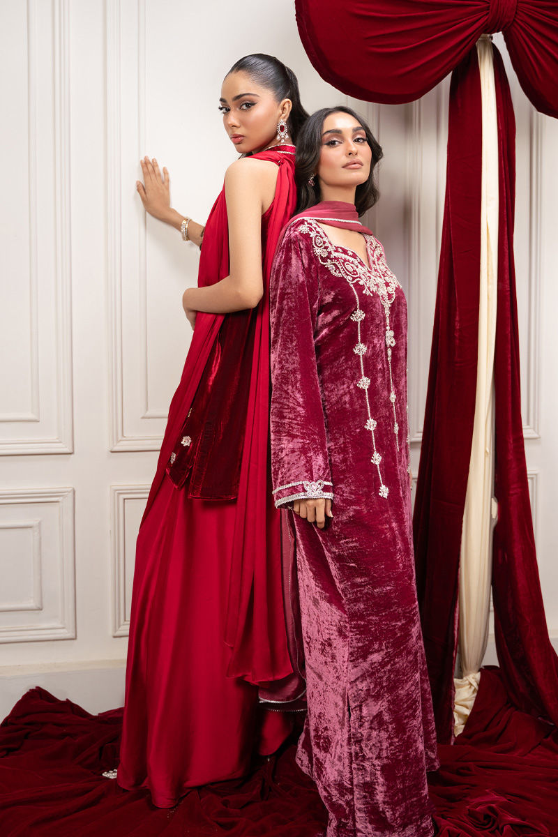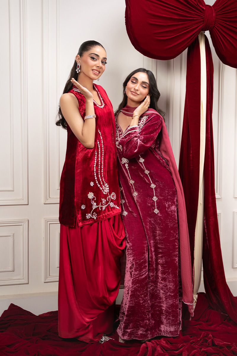 Indulge in timeless elegance with this luxurious red velvet short shirt, exquisitely hand-embellished with Swarovski stones, crystals, and dabka work, creating a masterpiece of shimmer and sophistication. The rich velvet fabric lends a regal allure, while the intricate craftsmanship adds a touch of modern opulence. Paired with a dhoti-style drape skirt - flowing duppata, the ensemble beautifully blends traditional artistry with contemporary charm — perfect for festive soirées, weddings, or statement evening wear. Shirt Length: 32''Model Height: 5'8