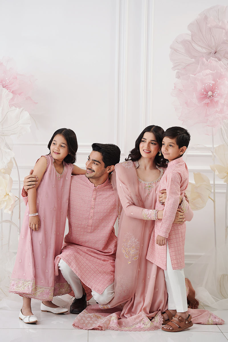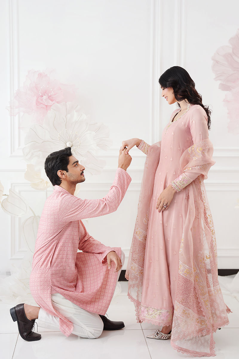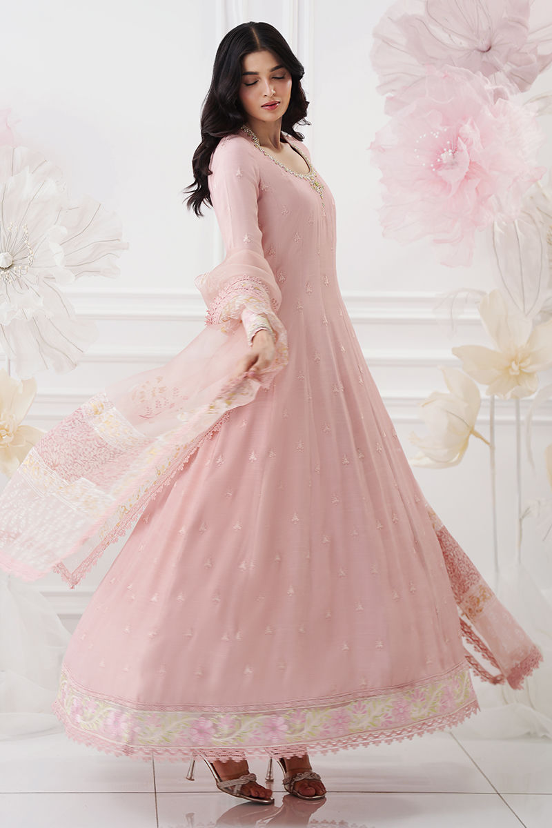 A graceful pink kalidar crafted from luxurious silk, adorned with finely embroidered booties scattered all over for a timeless, elegant appeal. The neckline is delicately hand-worked with dabka, resham, and Swarovski crystals, adding a subtle touch of shimmer. The hem is beautifully finished with an embroidered border that enhances the flow of the silhouette. Paired with an airy organza dupatta featuring classic block print and lace finishing. Complete the look with matching silk pants, available as an add-on for a perfectly coordinated ensemble. Model height: 5'8, shirt length: 56