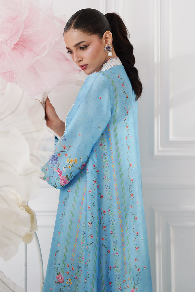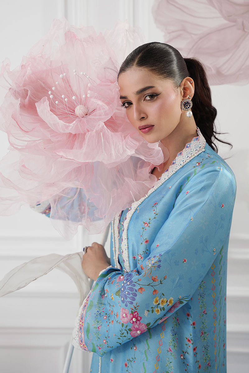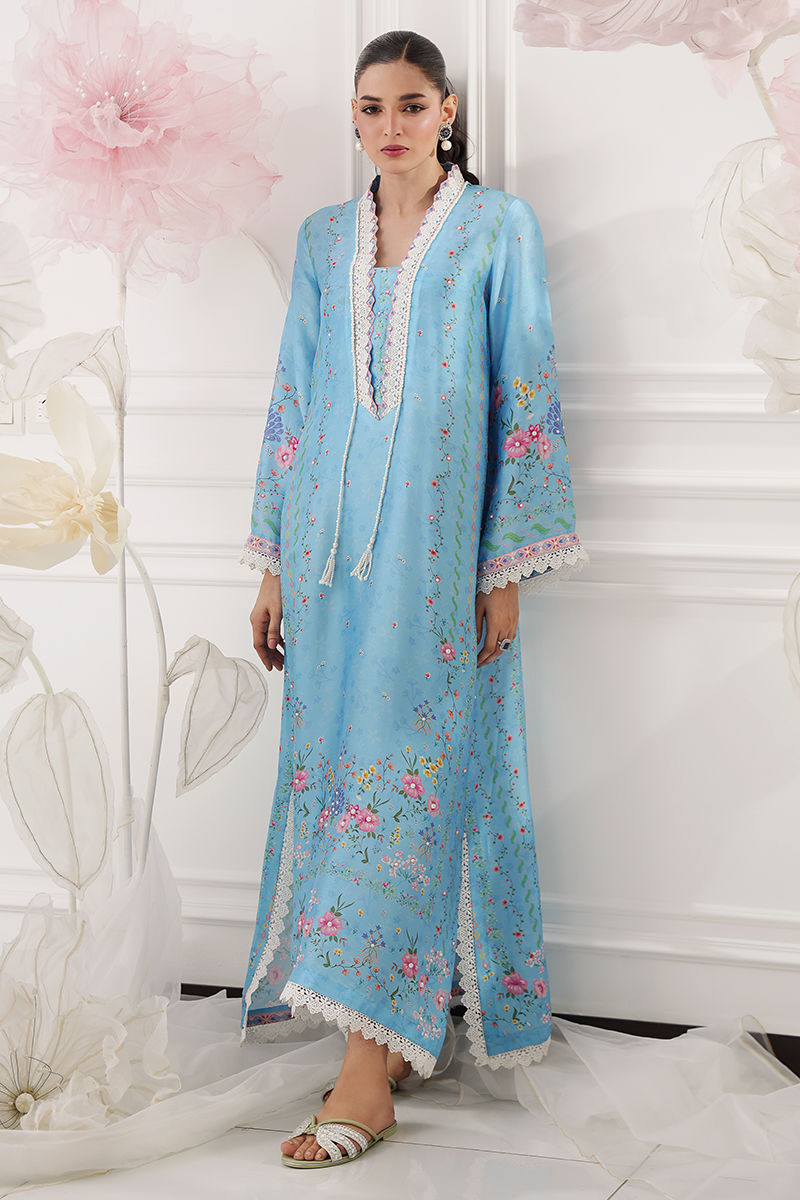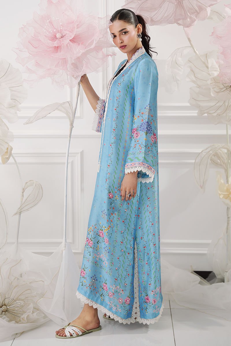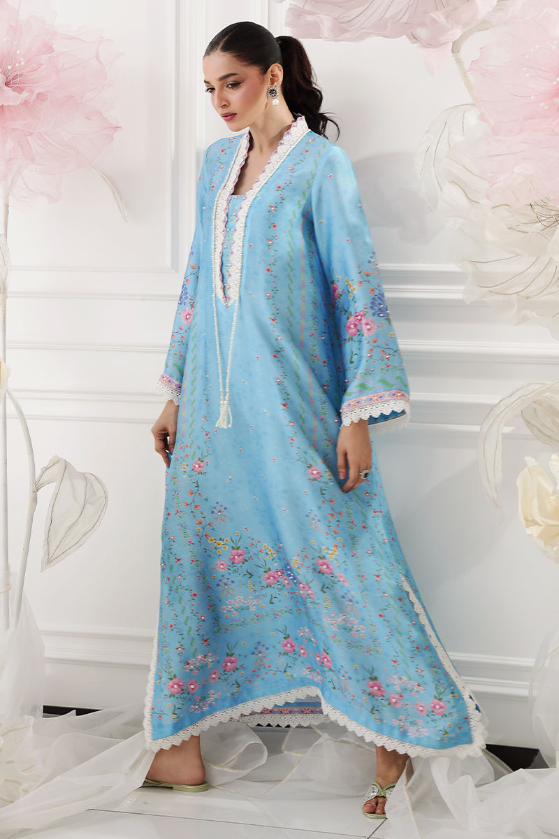 A flowy kaftan crafted from luxurious butter silk, printed in a beautiful shade of blue with soft floral motifs that exude effortless elegance. Delicate pearl detailing is scattered all over, adding a subtle, graceful shimmer, while pearl tassels hang elegantly to enhance the silhouette. A perfect blend of comfort and sophistication, ideal for relaxed festive wear or refined day occasions. Model height : 5'8 , Shirt length: 53