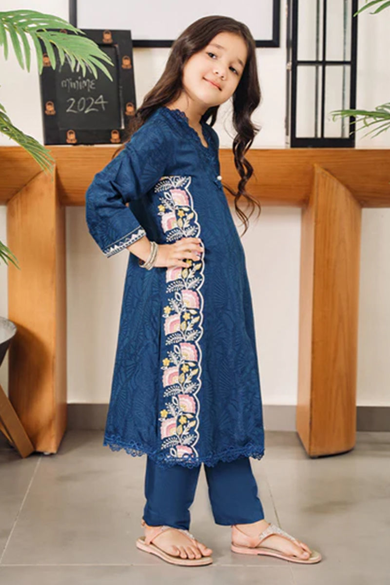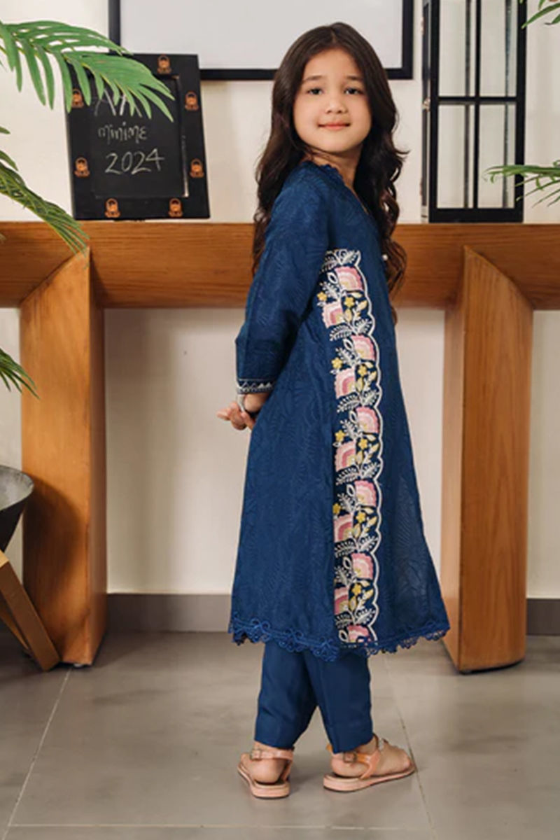 A mini me version of our navy blue shirt is super cute with embroidery and lace detailing with statement pleated neckline and pearl embellishment. Pants are on silkShirt: In-House Embossed SilkPant: In-House Embossed Silk