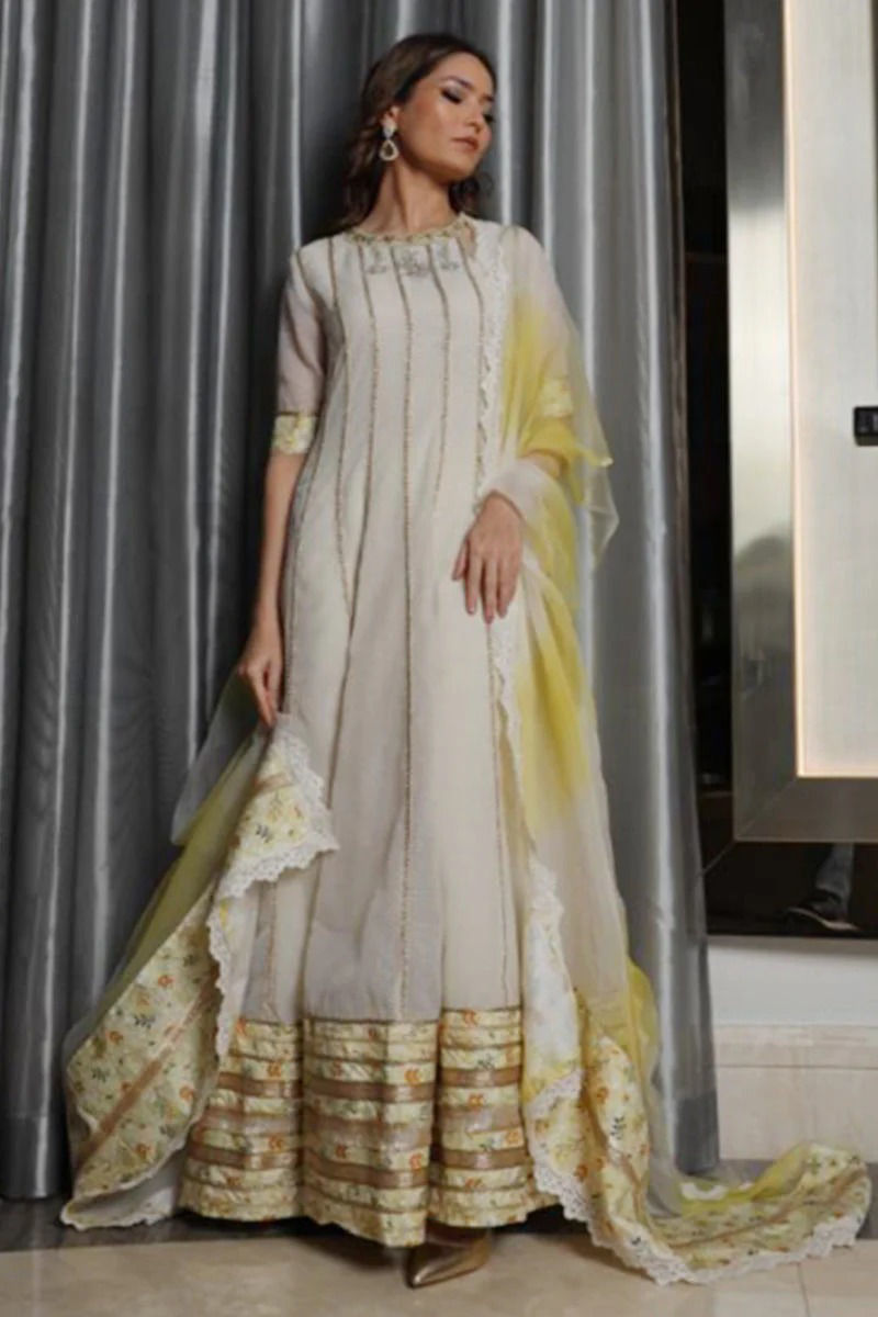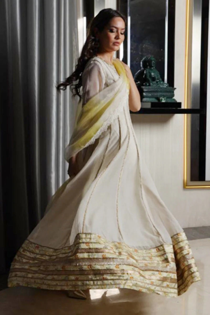 Opulent cotton organza Peshwas in ivory is ever so classy with our in-house lemon printed silk borders with amalgamation of Gota laces. Neckline is detailed with Gota and hand work making it a statement. Two toned organza dupatta is finished with laces and our in-house print on pallus with Gota which brings the whole look together.