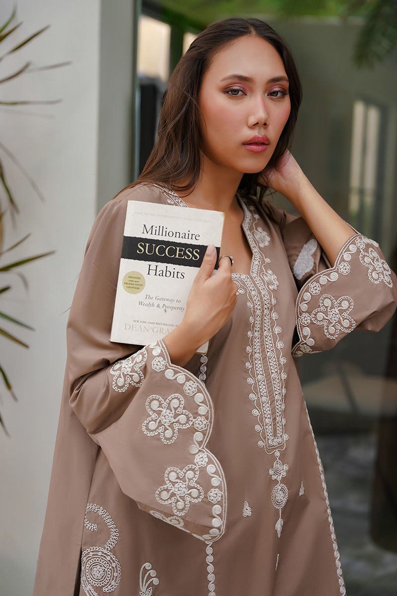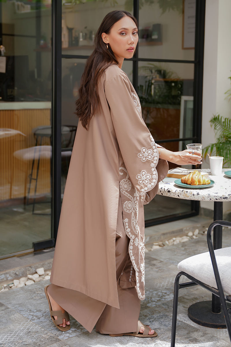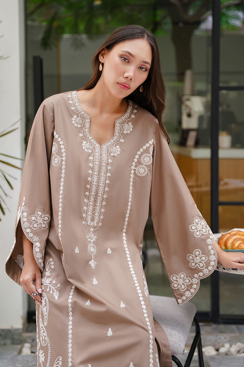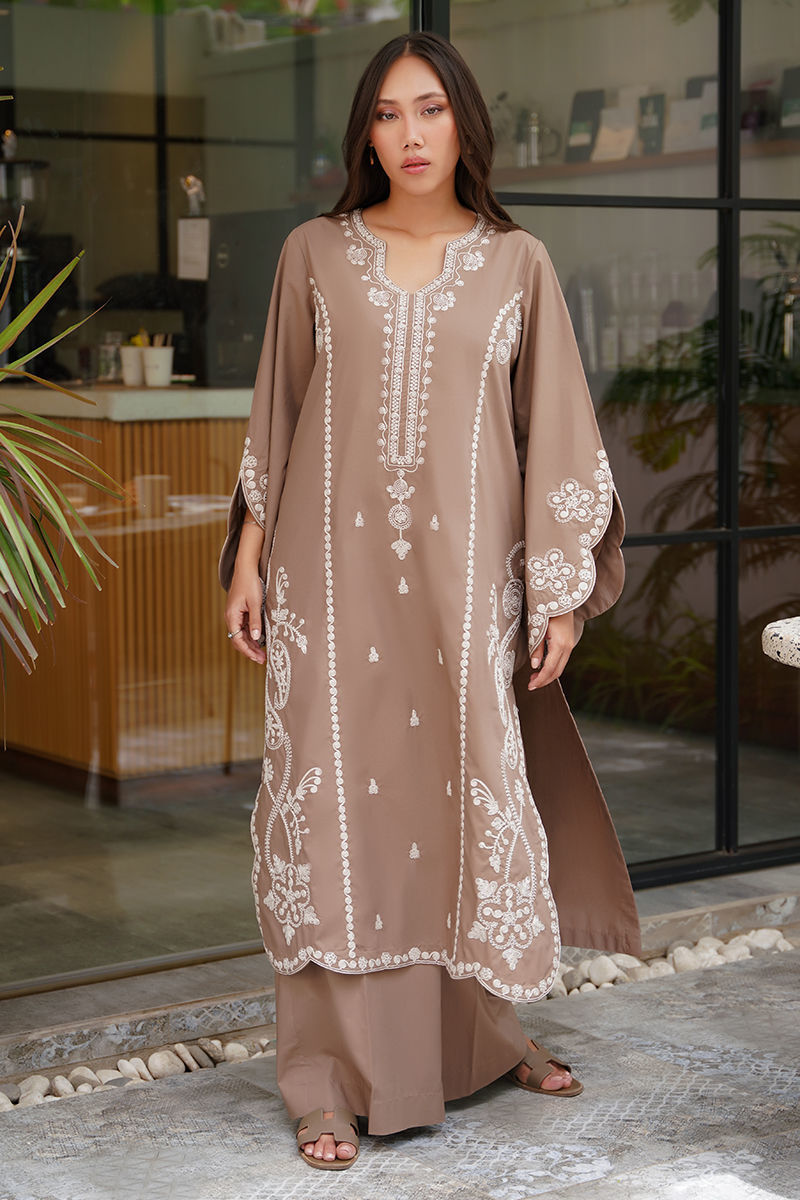 Elevate your wardrobe with this sophisticated latte brown ensemble, featuring a long, scalloped shirt adorned with intricate embroidery inspired by classic dori work in soft off-white thread. Paired with tailored pants for a clean, polished look, the outfit is completed with a flowing silk dupatta ( as an add on) trimmed in fine lace. Ideal for festive gatherings or formal daytime affairs, this ensemble exudes understated elegance with every detail. maximum shirt length:46 Model height:5'5 Style: Loose Fit Shirt: Cambric Lawn Dupatta: Tissue Silk Trouser: Cambric Lawn