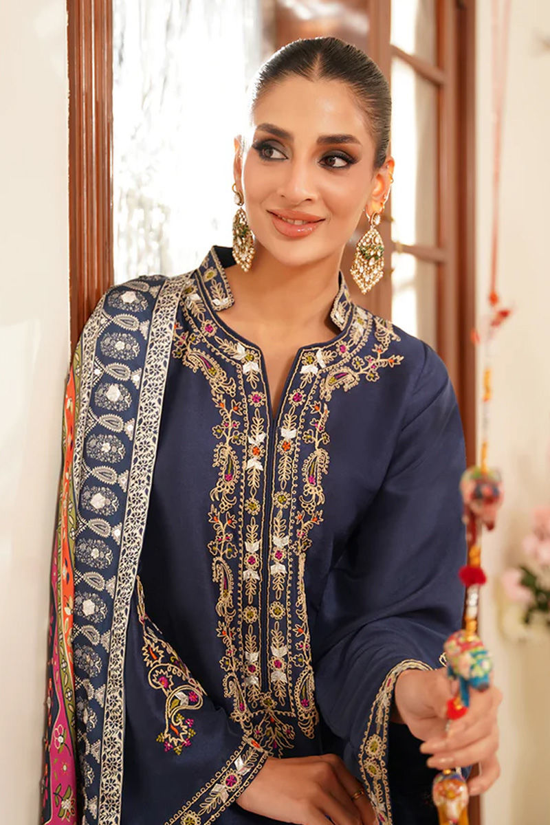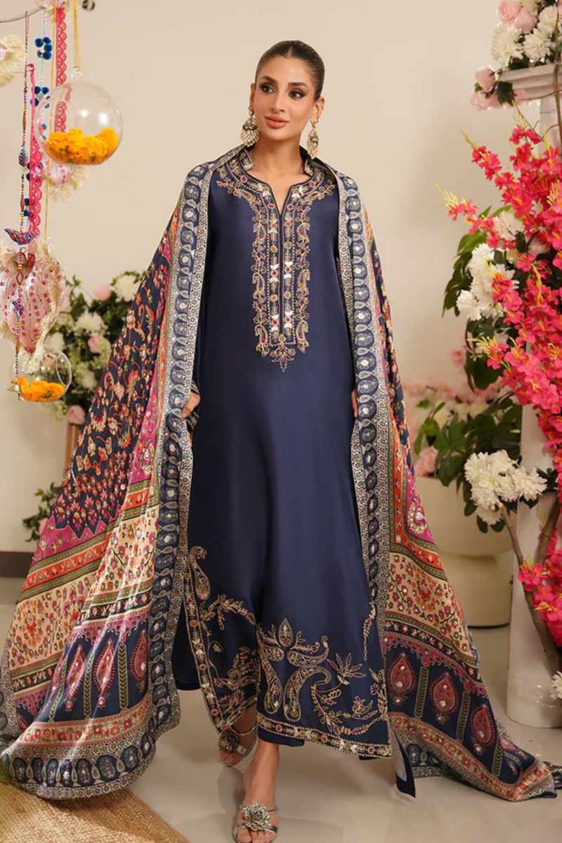 Elevate your festive wardrobe with this exquisite blue shirt crafted from pure raw silk, adorned with delicate embroidery in soft tones of beige, pinks, and orange, beautifully accented with silver gota work. The intricate detailing against the rich blue base creates a refined yet vibrant look, perfect for celebratory occasions.Paired with tailored straight pants, the silhouette remains timeless and effortlessly graceful.Adding a luxurious touch, the ensemble is completed with a digitally printed charmeuse silk chaddar, featuring all-over embellishments that blend traditional craftsmanship with contemporary elegance. The chaddar’s fluid drape and intricate detailing make it a true statement piece.Shirt maximum length: 52Model height 5’8