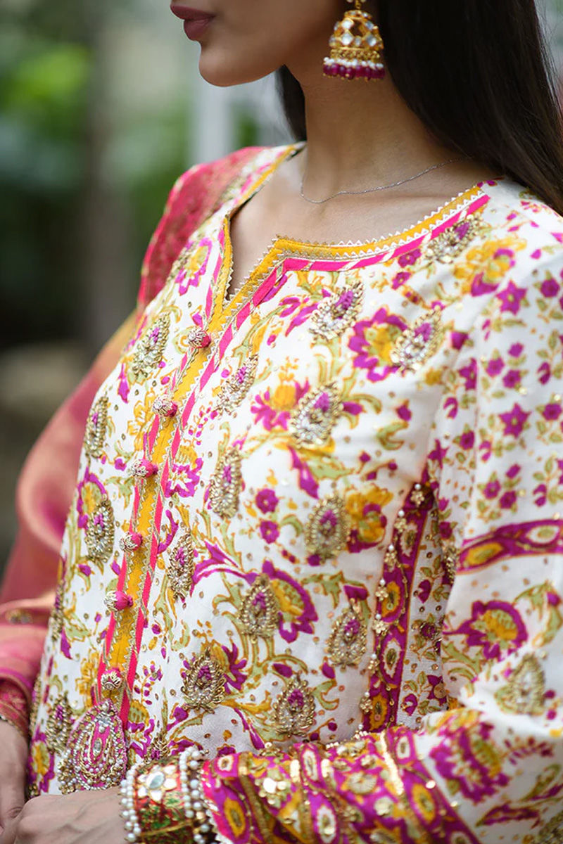 Cut from plush pure silk the perfect mehndi or mayun outfit! Kurta is handprinted in rich hues of pinks mustard and orange! This outfit has an aura around it, enough to make heads turn around! It is fully hand worked with zardozi kora dabka gota to make it perfect fit for traditional formal in your closet! It is paired with a beautiful two-toned mustard and pink tissue duppata finished with banarasi finishing’s and gotta chan. We have paired it up with a hot pink ijzar with banarasi finishing’s! This is one of our favourites and highly recommended! Shirt: Raw Silk Dupatta: Raw Silk Pant: Raw Silk