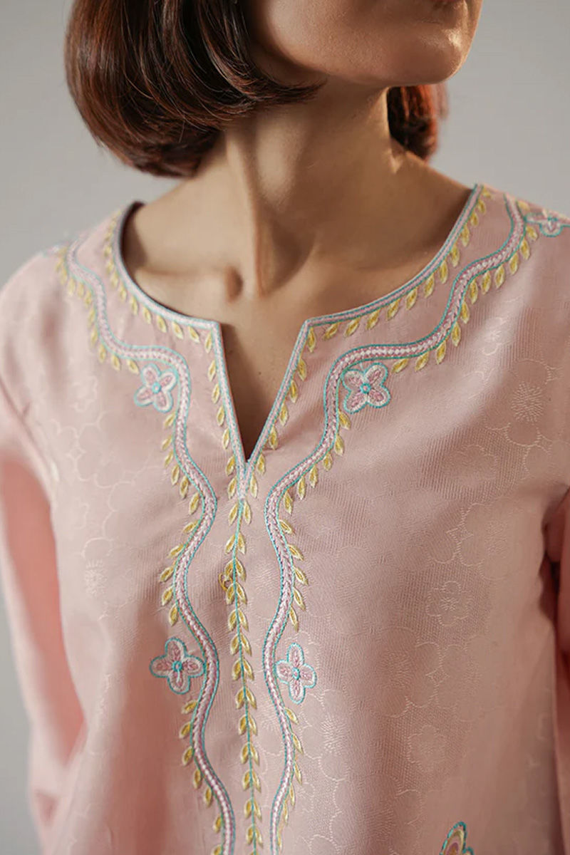 This charming soft pink kurta exudes a graceful, feminine vibe, crafted from our in-house self-printed fabric. The kurta features a beautifully embroidered scalloped hem, adding an element of elegance and sophistication. The pastel-colored embroidery along throughout the design brings a subtle pop of color, with hues of blue, yellow, and blush pink, which perfectly complement the soft pink fabric. Model height 5'9 Shirt maximum length 43