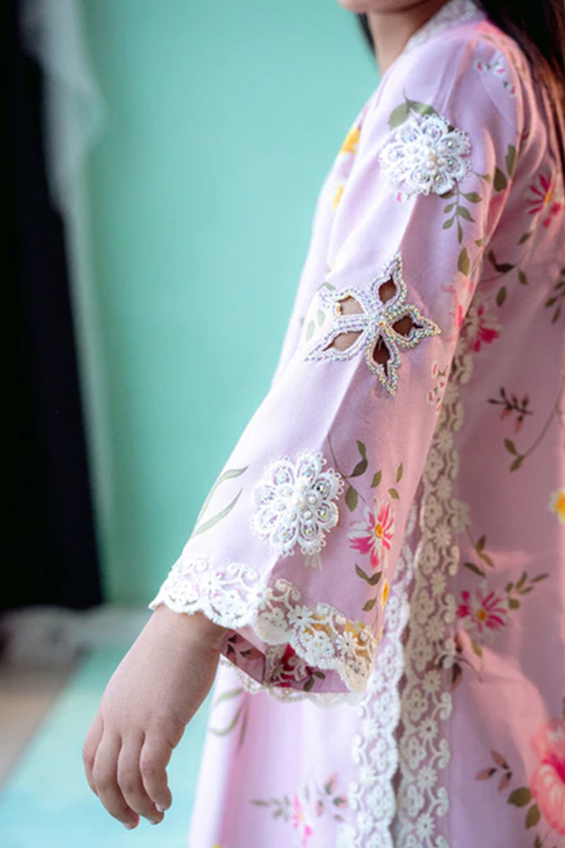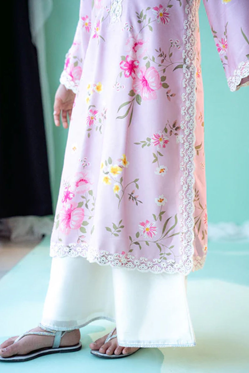 A stunning Khaddi Silk floral shirt in a soft mauve hue, perfect for a refined yet fresh look. The shirt features a stylish overlap collar, creating a flattering, asymmetrical neckline that adds a modern twist to the traditional fabric. The sleeves are beautifully detailed with cutwork embroidery, showcasing delicate floral patterns that enhance the shirt’s elegant appeal. Adding further charm are scalloped embroidery details along the side slits, elevating the overall design with a touch of intricate craftsmanship. The shirt is paired with a sheesha silk dhaka. Maximum shirt length : 31 " , Model height: 3'9