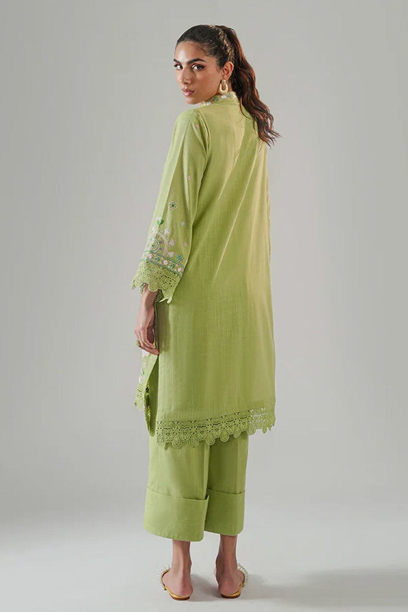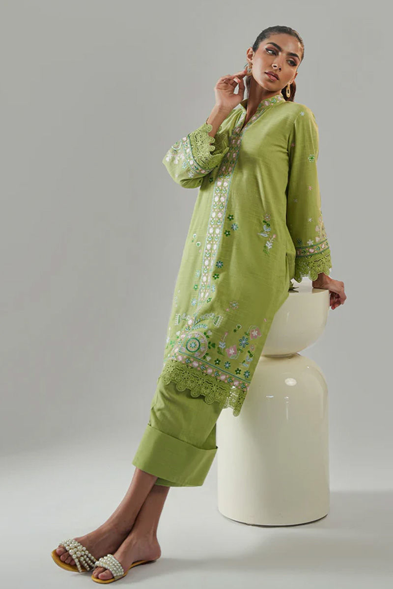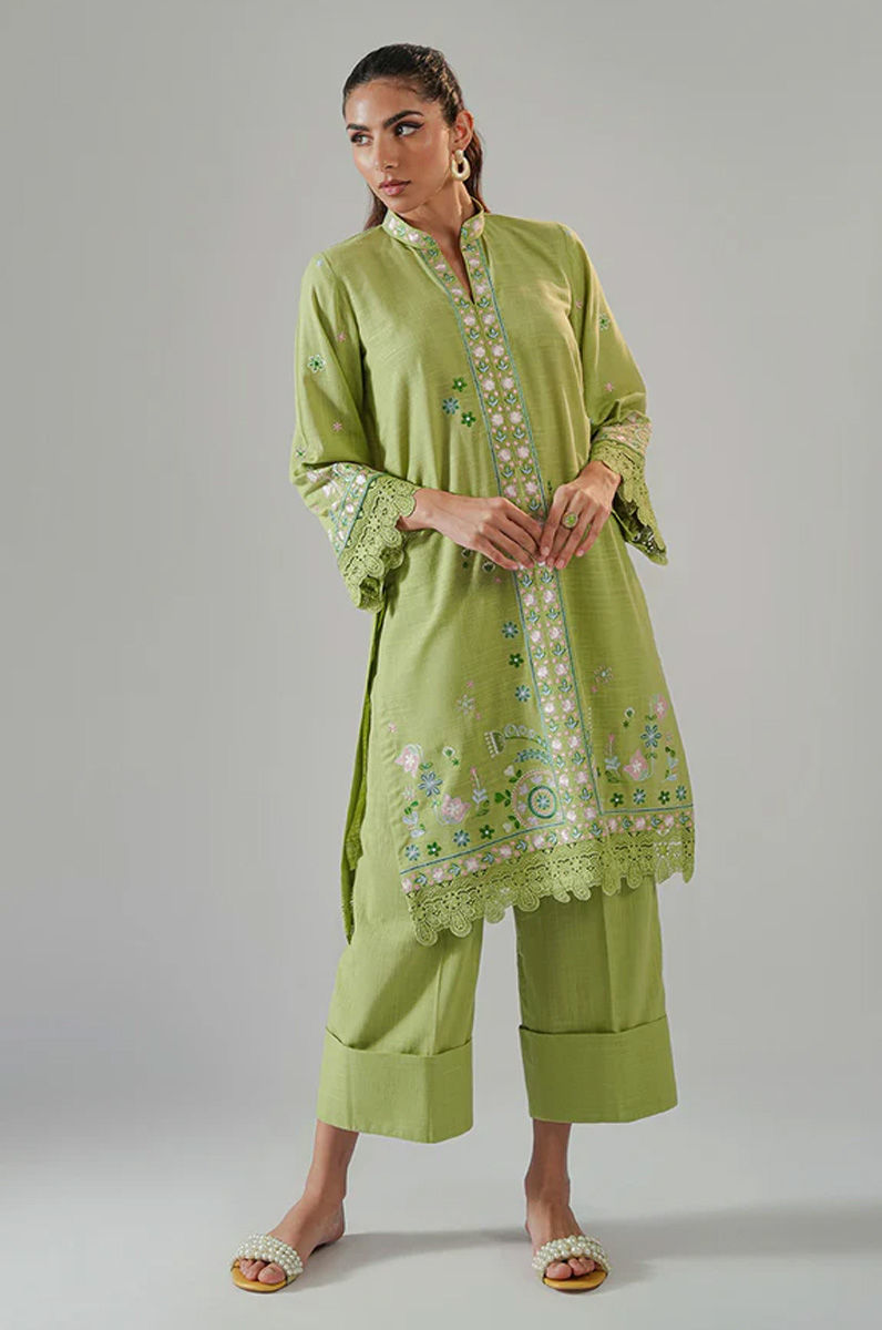 Green is the new black? Surely yes! This striking green embroidered kurta is a perfect blend of vibrant colors and intricate craftsmanship. The rich green fabric serves as a beautiful canvas for detailed embroidery in shades of pink, blue, and dark green, creating a lively, eye-catching design. The kurta is finished with delicate cutwork along the edges, adding a refined, feminine touch to the overall design. Paired with the kurta is a set of tailored trousers, featuring a cuffed bottom that adds a modern, clean finish to the outfit. Model height 5'10 Shirt length 30.