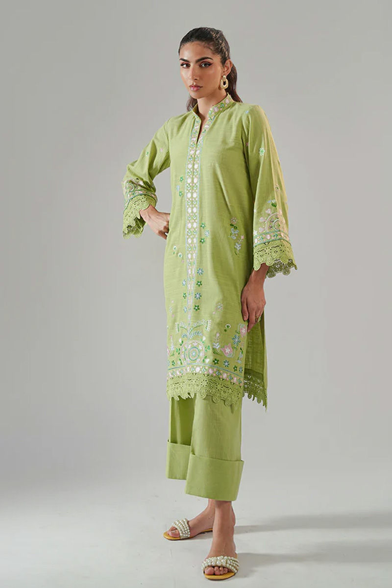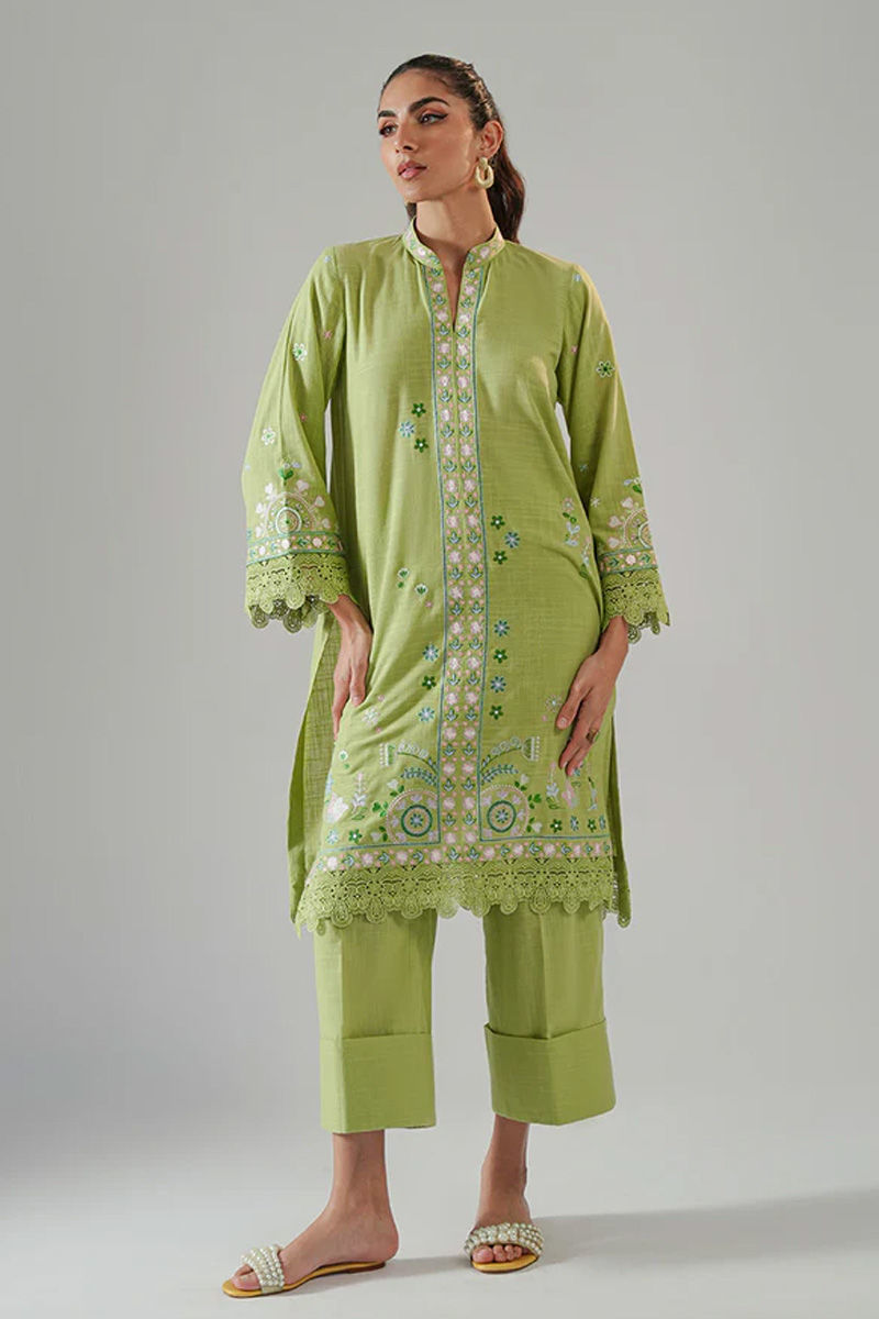 Green is the new black? Surely yes! This striking green embroidered kurta is a perfect blend of vibrant colors and intricate craftsmanship. The rich green fabric serves as a beautiful canvas for detailed embroidery in shades of pink, blue, and dark green, creating a lively, eye-catching design. The kurta is finished with delicate cutwork along the edges, adding a refined, feminine touch to the overall design. Paired with the kurta is a set of tailored trousers, featuring a cuffed bottom that adds a modern, clean finish to the outfit. Model height 5'10. Shirt length 30.