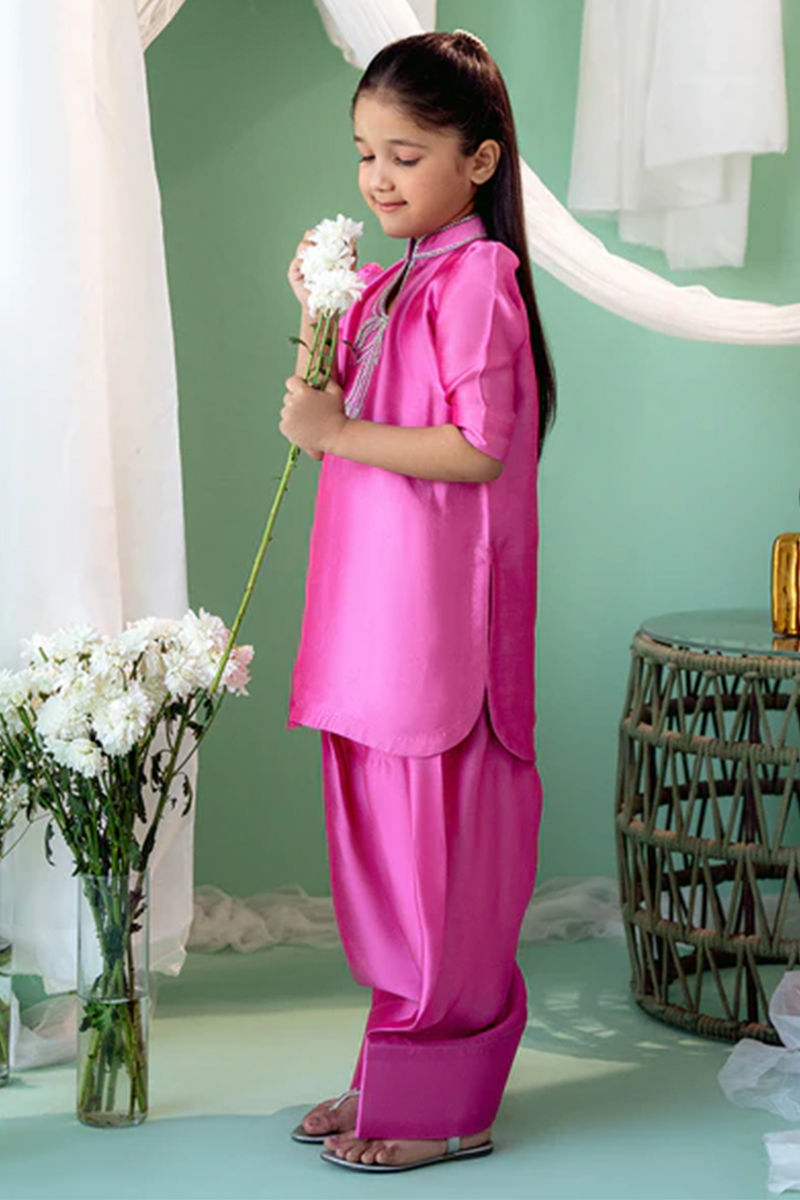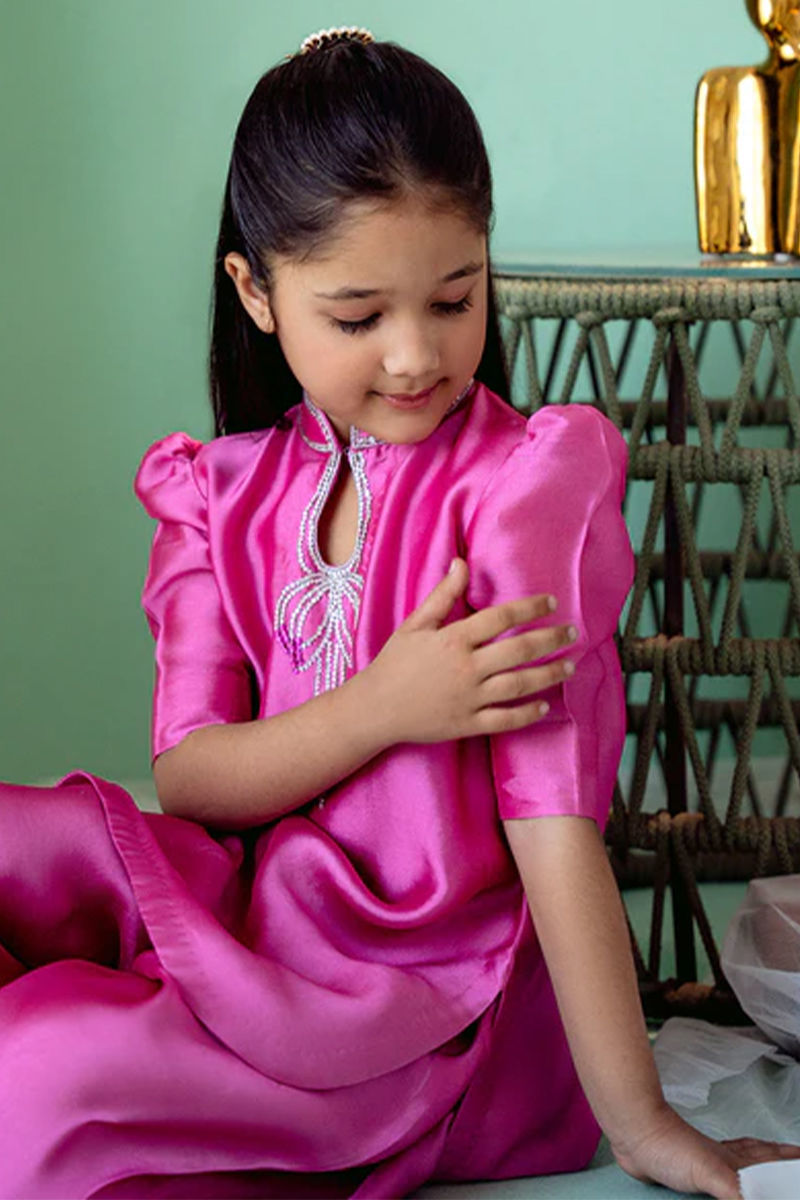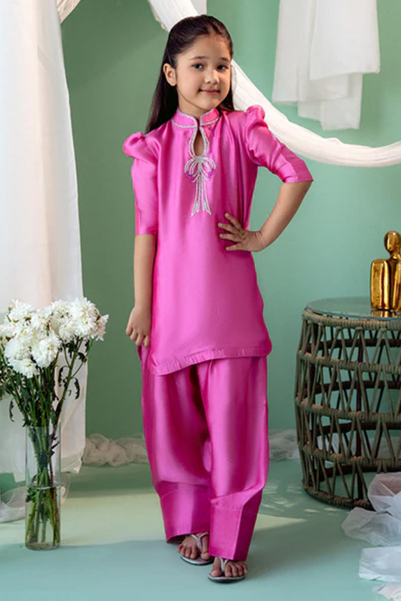 An elegant Sheesha silk shirt and shalwar set that exudes luxury and sophistication. The shirt is crafted from rich, lustrous Sheesha silk, offering a soft, fluid drape that catches the light with every movement. The neckline is adorned with intricate hand-embroidery, featuring delicate bow motifs that add a refined touch of charm and elegance. Maximum shirt length: 23" , model height : 3'9