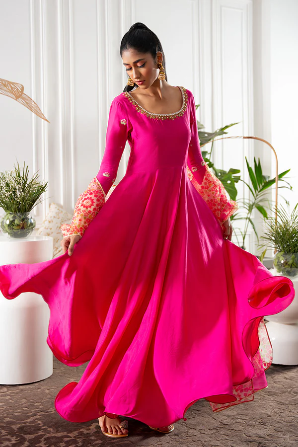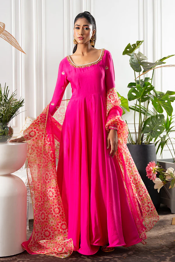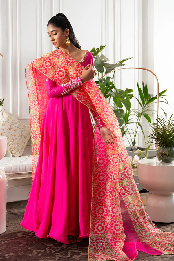 Oh so traditional and luxe is this khaddi silk hot pink flowy kalidar. Amalgamation of hand work( kora dabka, crystals, resham) and embroidery on sleeves is minimal yet so impactful making it perfect for the upcoming shaadi season and Eid get togethers. The dupatta steals the show…our in-house print in contrasting colours and hot pink, finished off with kingri Gota lace. Put statement Tassles at the back makes the back dramatic. Pants are on silk. Style it up with kundan jewellery or studs and a dainty pouch or clutch this season