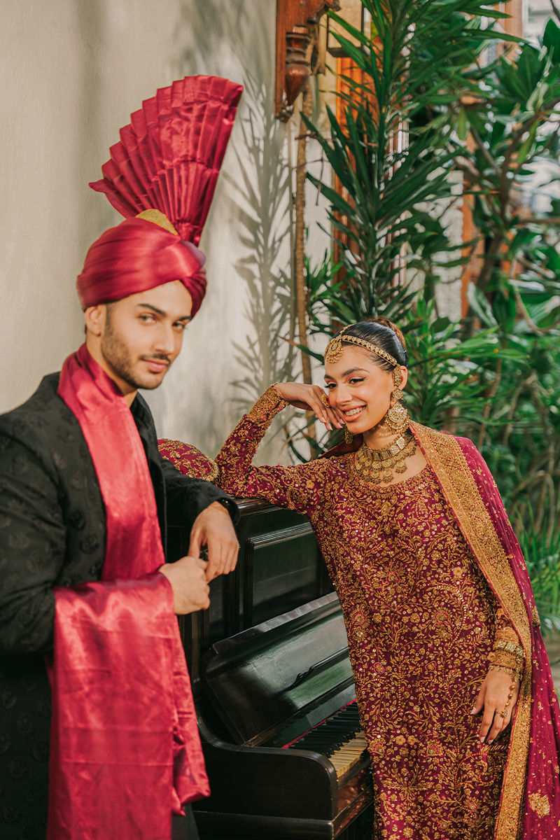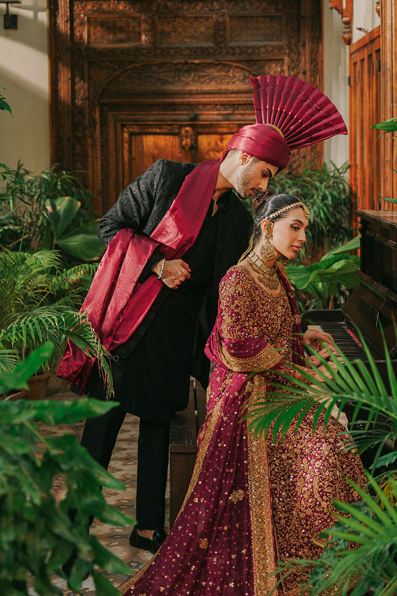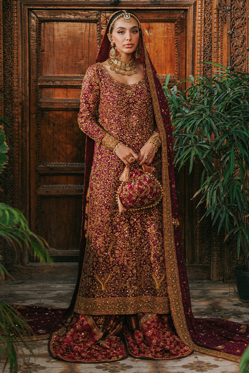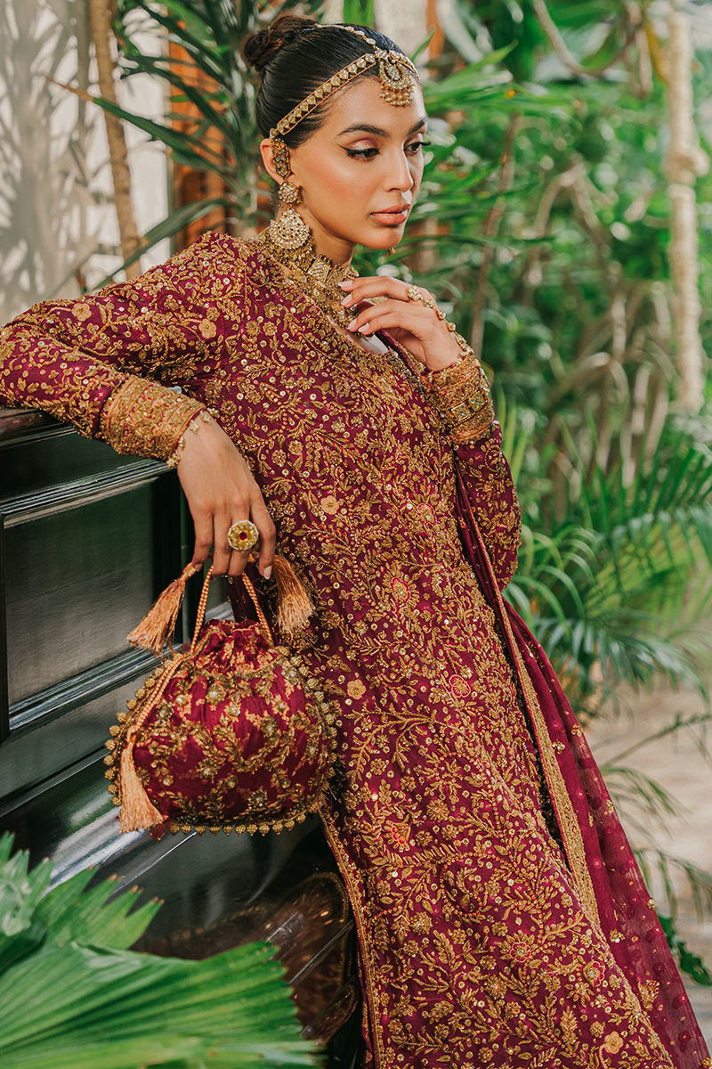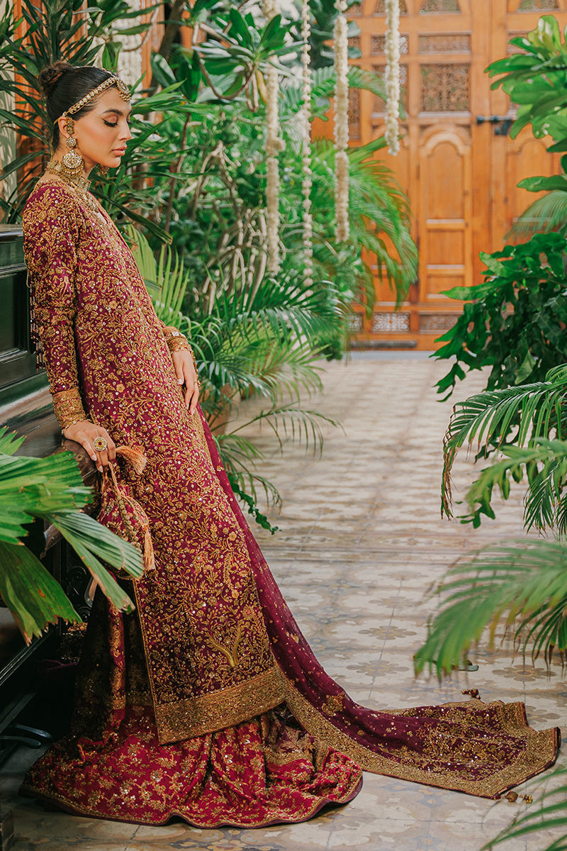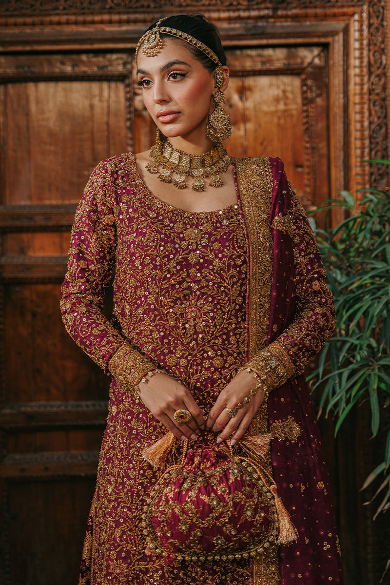 Embrace elegance and timeless beauty with this exquisite bridal ensemble in deep burgundy maroon. Crafted from pure silk net, the straight-cut shirt boasts a graceful silhouette, adorned with intricate hand embroidery that showcases countless hours of expert craftsmanship. The tailored farshi lehenga with a hot red frilled edge, made from luxurious pure jamawar, flows with a regal charm, perfectly complementing the shirt’s delicate embroidery. Completing the look is a classic draped dupatta, also heavily embroidered, adding a sophisticated touch to this opulent outfit. The ensemble's rich, deep hues are enhanced by the fine detailing of the embroidery, which features a blend of traditional motifs and contemporary designs. Each stitch reflects the dedication and artistry of the artisans, making this outfit not just a piece of clothing, but a work of art. Hand-crafted Tassels are given at the back to lift the overall outfit. Pair the outfit with a regal hand-worked pouch giving the oomph to the regal look. Styling tip: A statement necklace with intricate designs, matching chandelier earrings, and a delicate maang tikka can enhance the regal appeal!