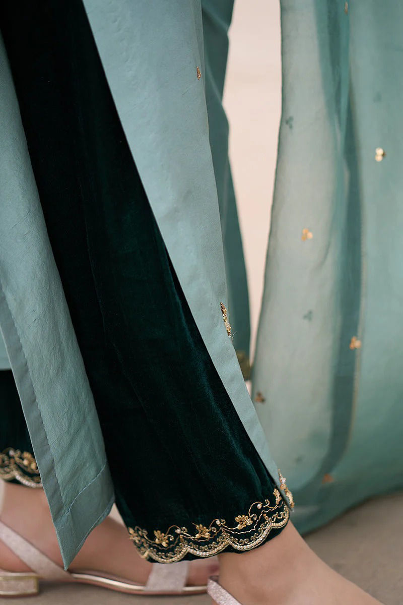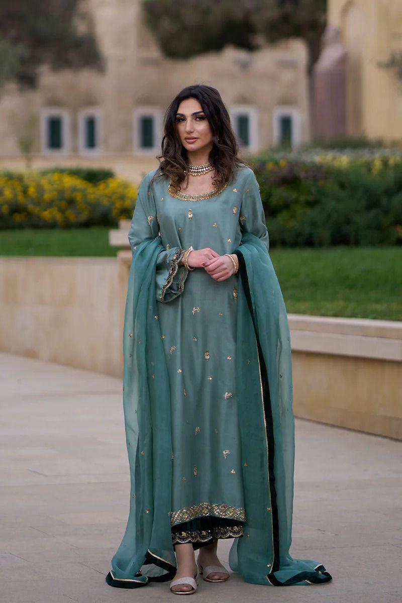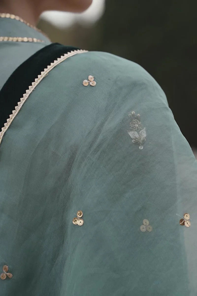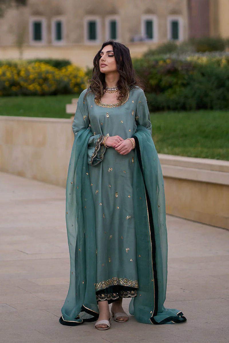 Duck green pure raw silk shirt with hand work( kora dabka ) , sequence and Gota. Green velvet appliqués on sleeeves and back make an impact that accompanies the velvet worked izaar with scallops. Subtle dupatta is on organza ,sprinkled with sequence and finished with four side velvet and Gota kingri.