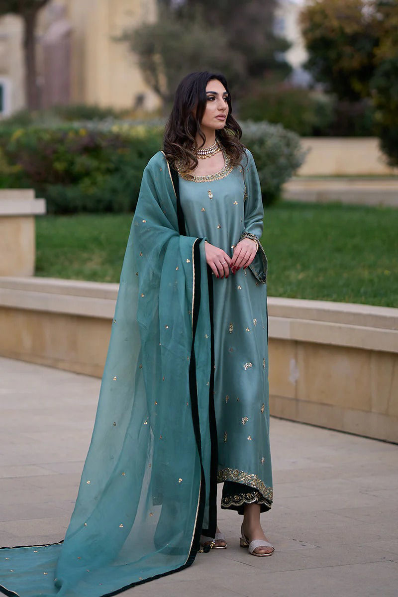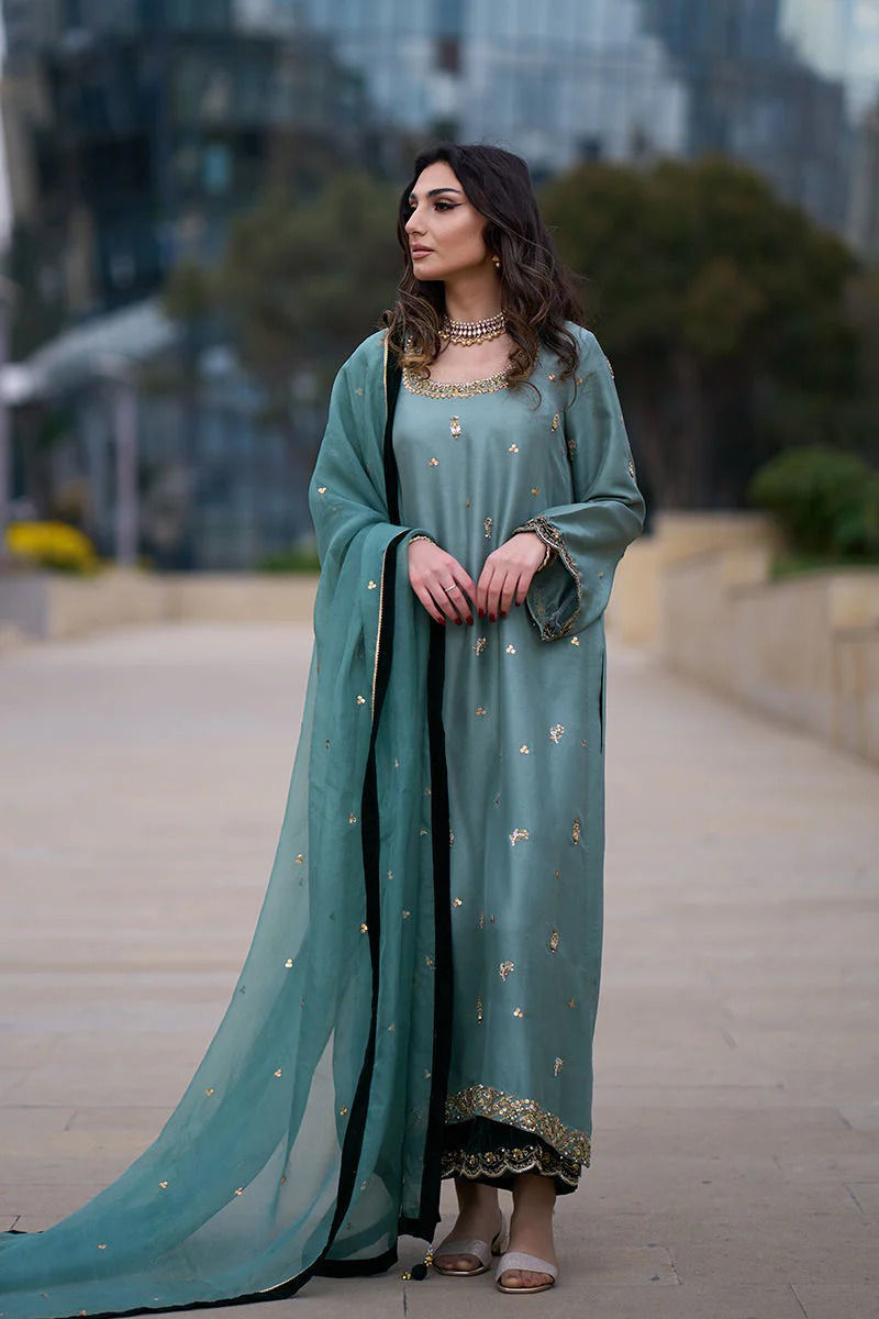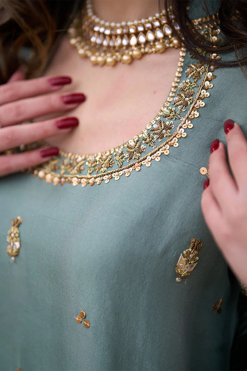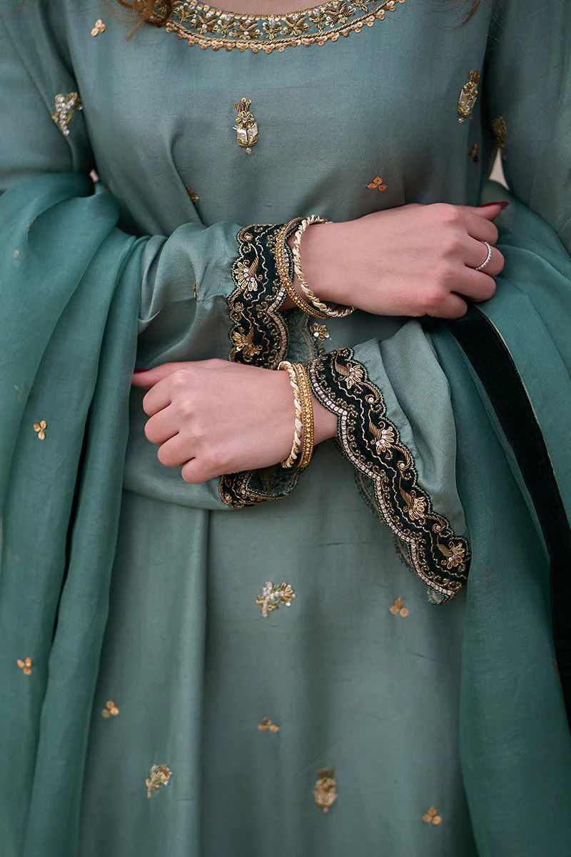Duck green pure raw silk shirt with hand work( kora dabka ) , sequence and Gota. Green velvet appliqués on sleeeves and back make an impact that accompanies the velvet worked izaar with scallops. Subtle dupatta is on organza ,sprinkled with sequence and finished with four side velvet and Gota kingri.