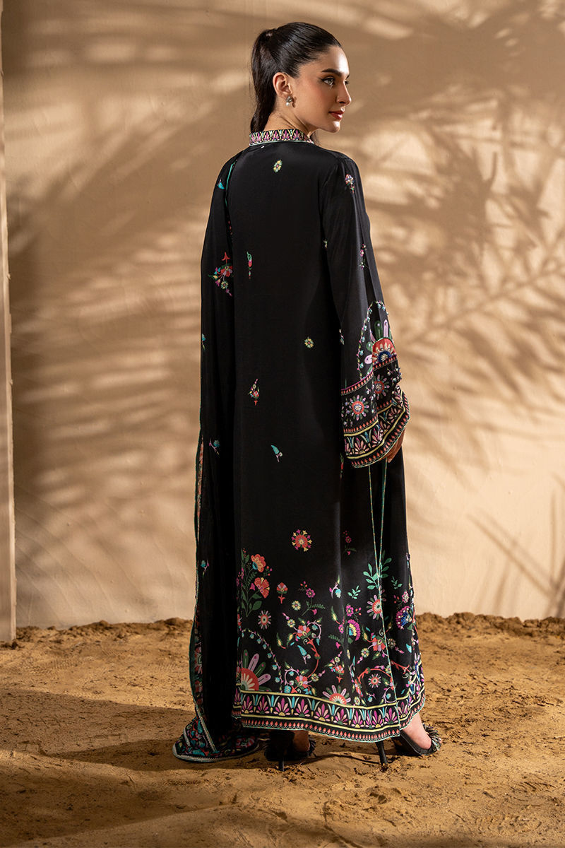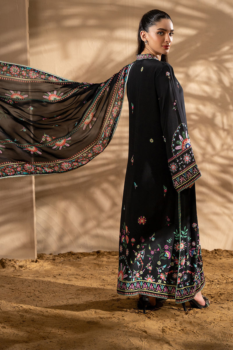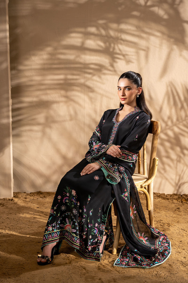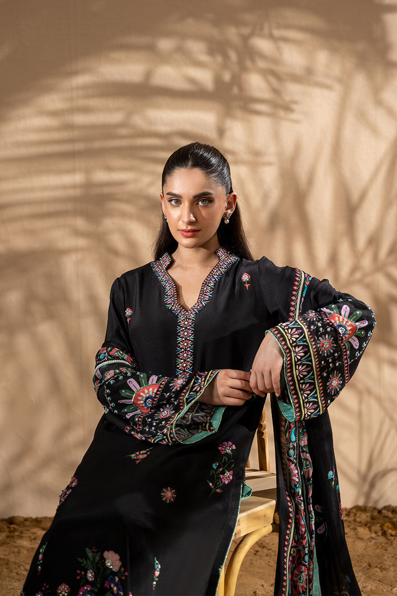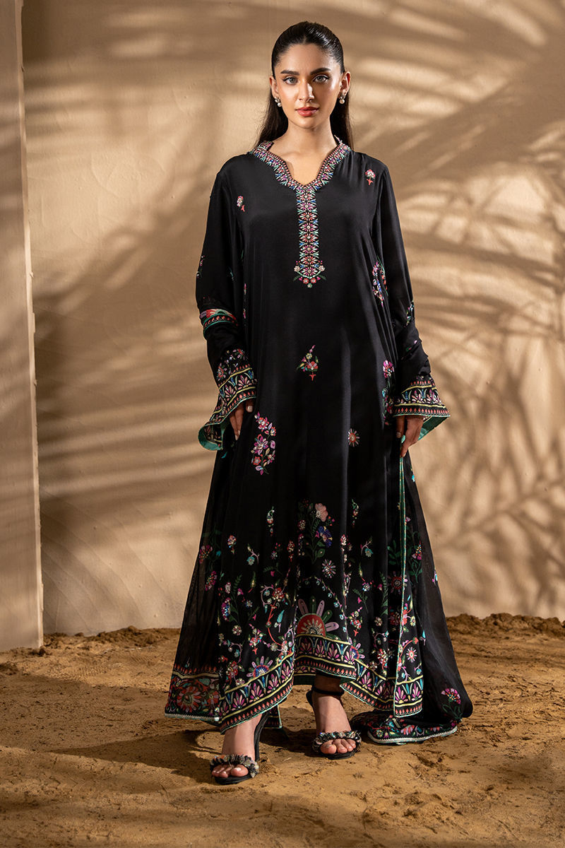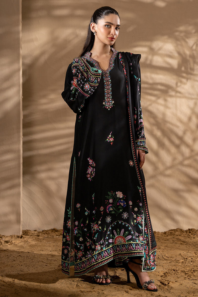 Featuring a stunning black kashmiri motif pure crepe print , the design is beautifully complemented by delicate floral motifs, creating a harmonious, eye-catching look. The shirt is adorned with shimmering pearls, multi sitara and Swarovski crystals, adding a touch of glamour and sophistication to the ensemble. Paired with a printed tissue silk dupatta, which gracefully drapes with a fine lace finish, this outfit exudes timeless beauty and refined style, perfect for special occasions or evening events. Pants are an add on.Shirt maximum length 50Model height: 5''2