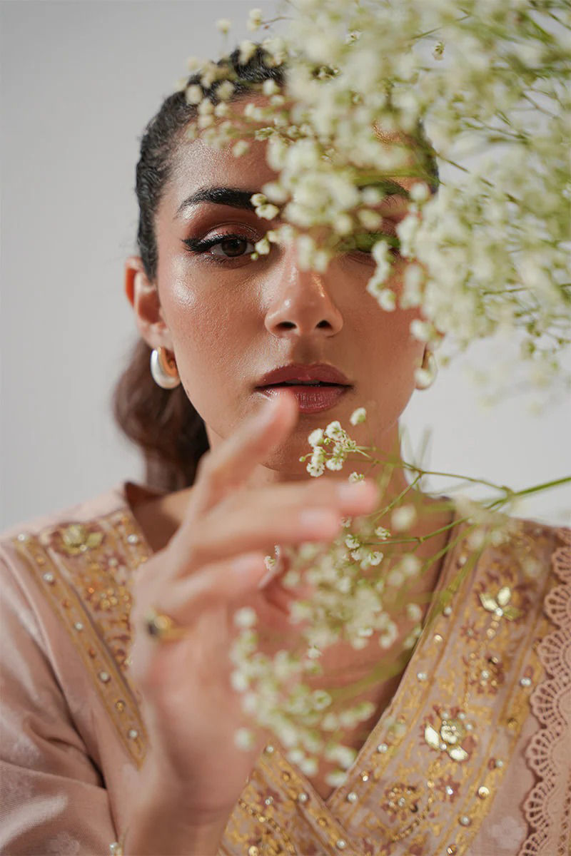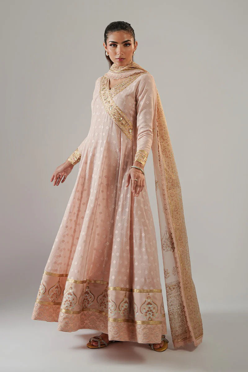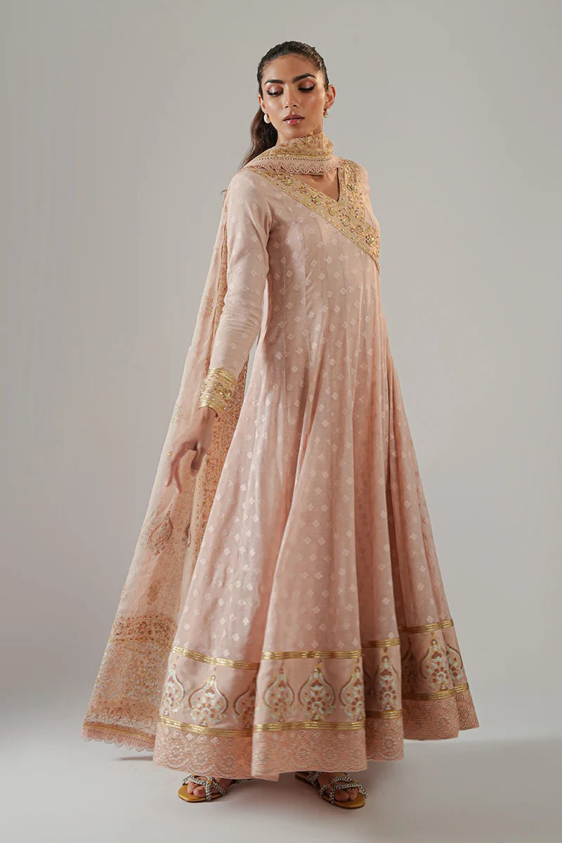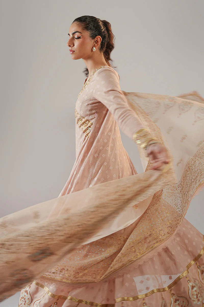 Our HOTSELLER cut is back!! Elegant cotton net nude pink kalidar exudes understated beauty with its intricate blockprint pattern, perfectly complemented by delicate hand embroidery that adds a touch of refined artistry. The kalidar is paired with an organza blockprinted dupatta, adorned with lace and finished with gota detailing that catches the light, adding a shimmering elegance to the look. This ensemble blends traditional craftsmanship with a modern, timeless appeal, making it a perfect choice for a special occasion or a festive celebration. Silk pants are an add on. Model height: 5'10. Maximum shirt length: 55"
