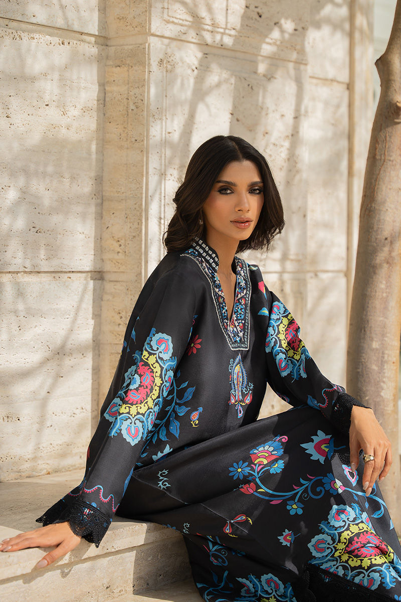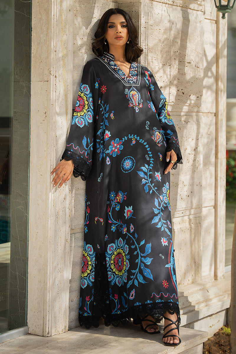 A striking black pure rawsilk kaftan cut, elevated with intricate aari embroidery and graceful ivory fabric appliqué detailing on the hem and sleeves. The embroidery is further enhanced with subtle Swarovski crystal embellishments, adding a refined hint of shimmer to this timeless silhouette.Model is wearing 55" length Eid styling tip: pair with statement pearl earrings, metallic heels, and a sleek clutch for an effortlessly elegant festive look.