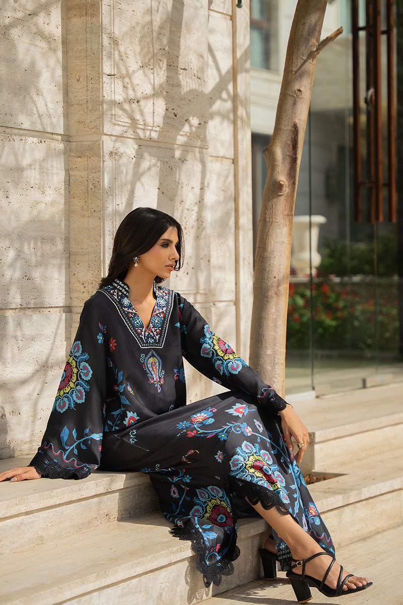 A striking black pure rawsilk kaftan cut, elevated with intricate aari embroidery and graceful ivory fabric appliqué detailing on the hem and sleeves. The embroidery is further enhanced with subtle Swarovski crystal embellishments, adding a refined hint of shimmer to this timeless silhouette.Model is wearing 55" length Eid styling tip: pair with statement pearl earrings, metallic heels, and a sleek clutch for an effortlessly elegant festive look.