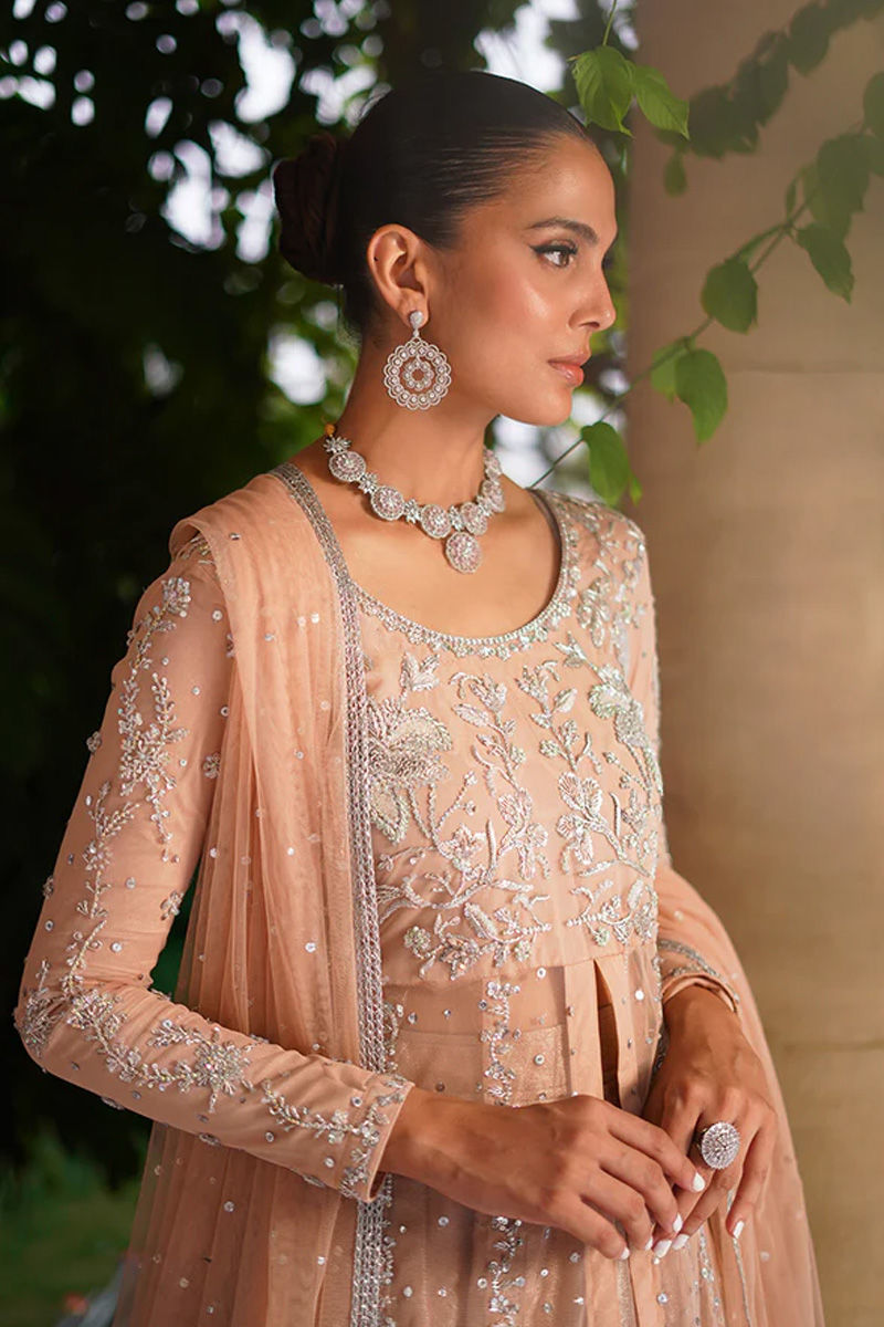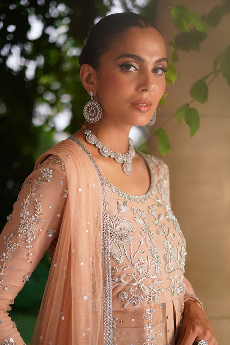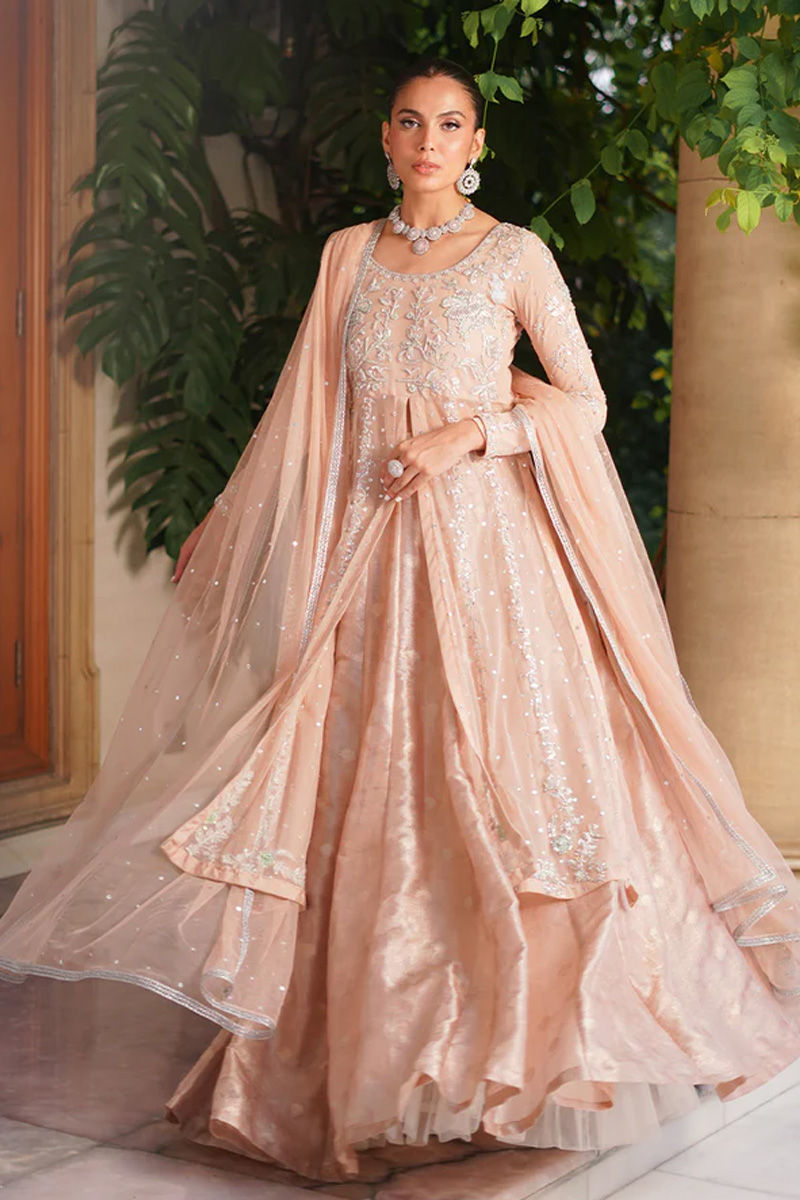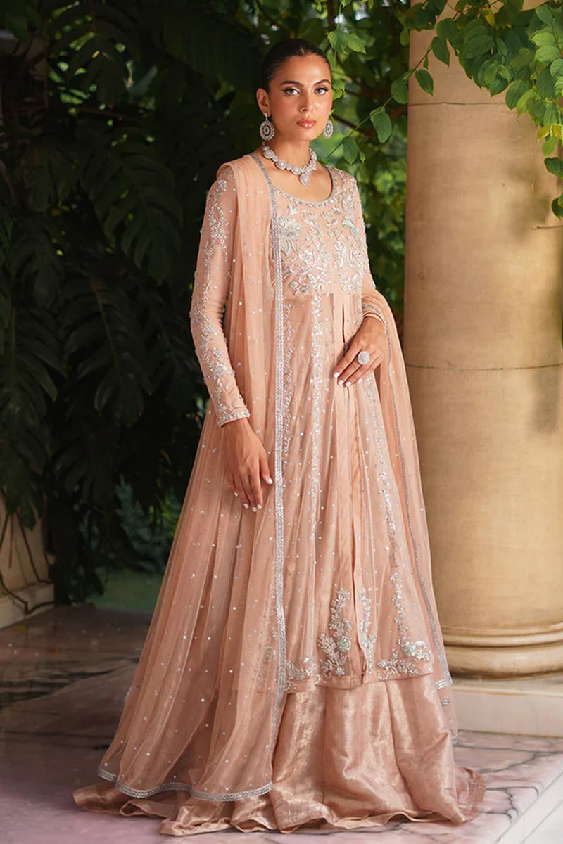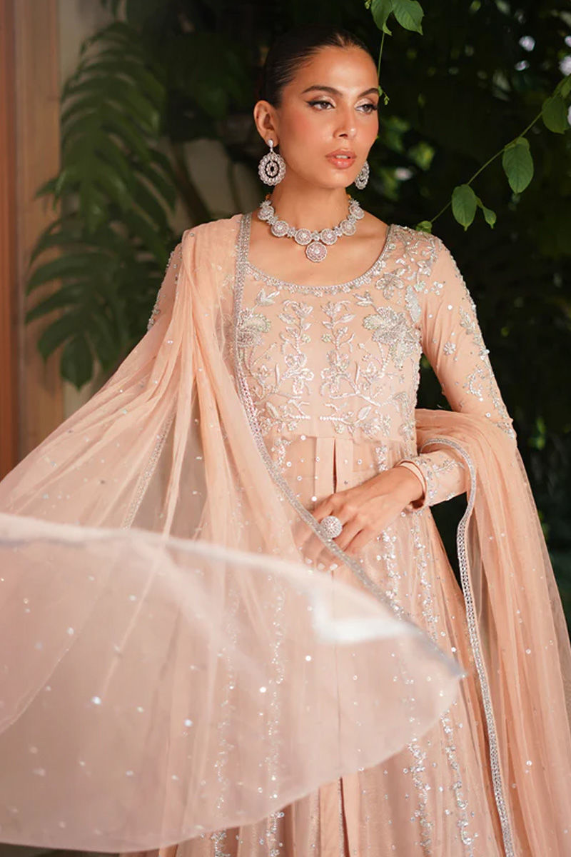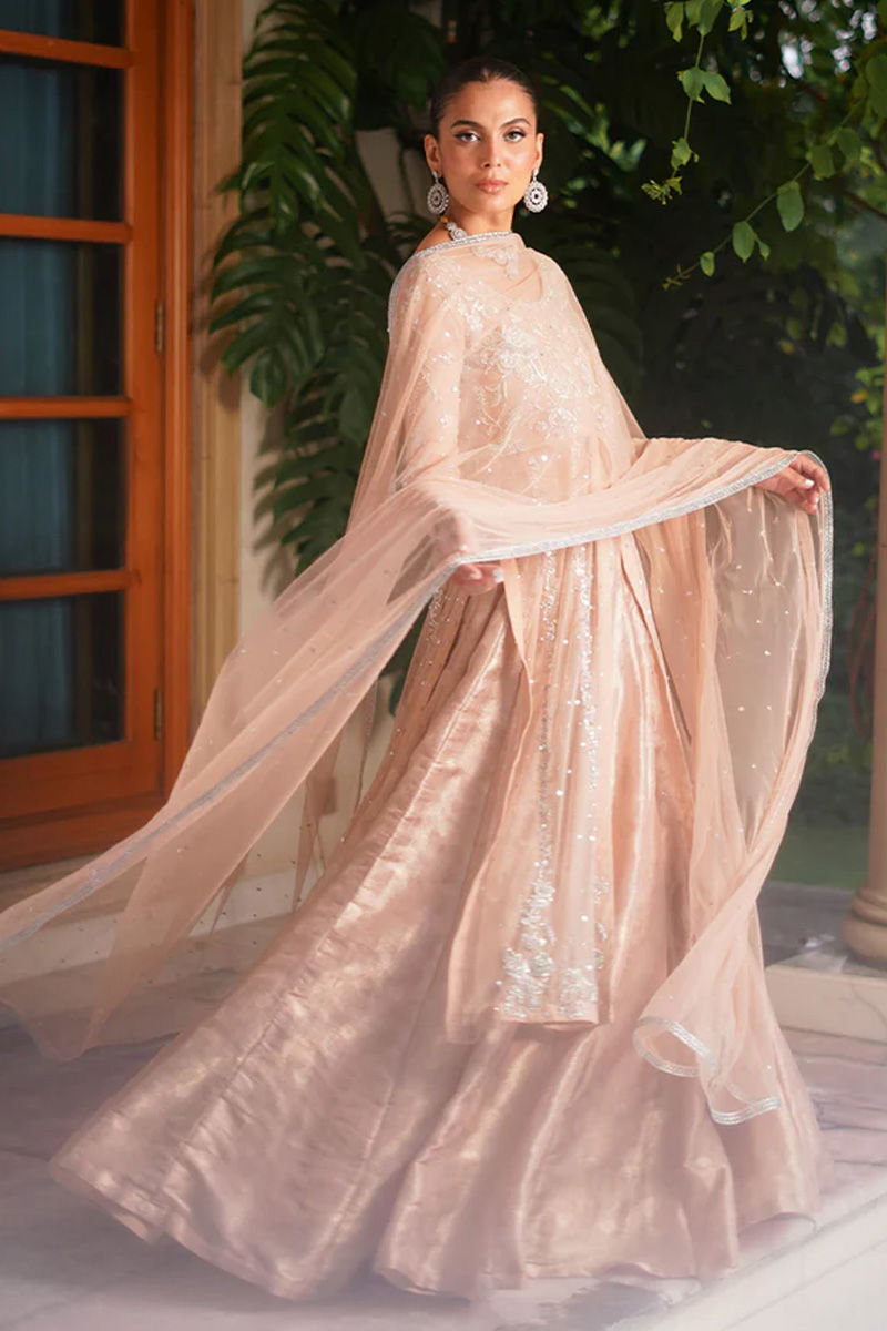 Delicate and graceful, this pink net paneled shirt with a front opening is adorned with intricate silver dabka, sitara, stones, and resham embroidery, creating a refined sparkle against the soft hue. It is paired with a net dupatta sprinkled with delicate chan, adding an airy elegance to the look. Completing the ensemble, a voluminous self-silk lehenga lends depth and regal charm, making this outfit a perfect balance of softness and grandeur. Lehenga: Self Silk Shirt: Net Dupatta: Net