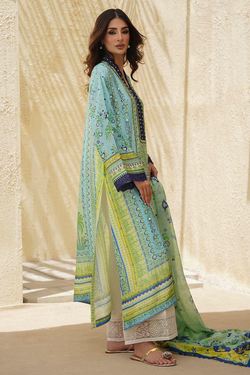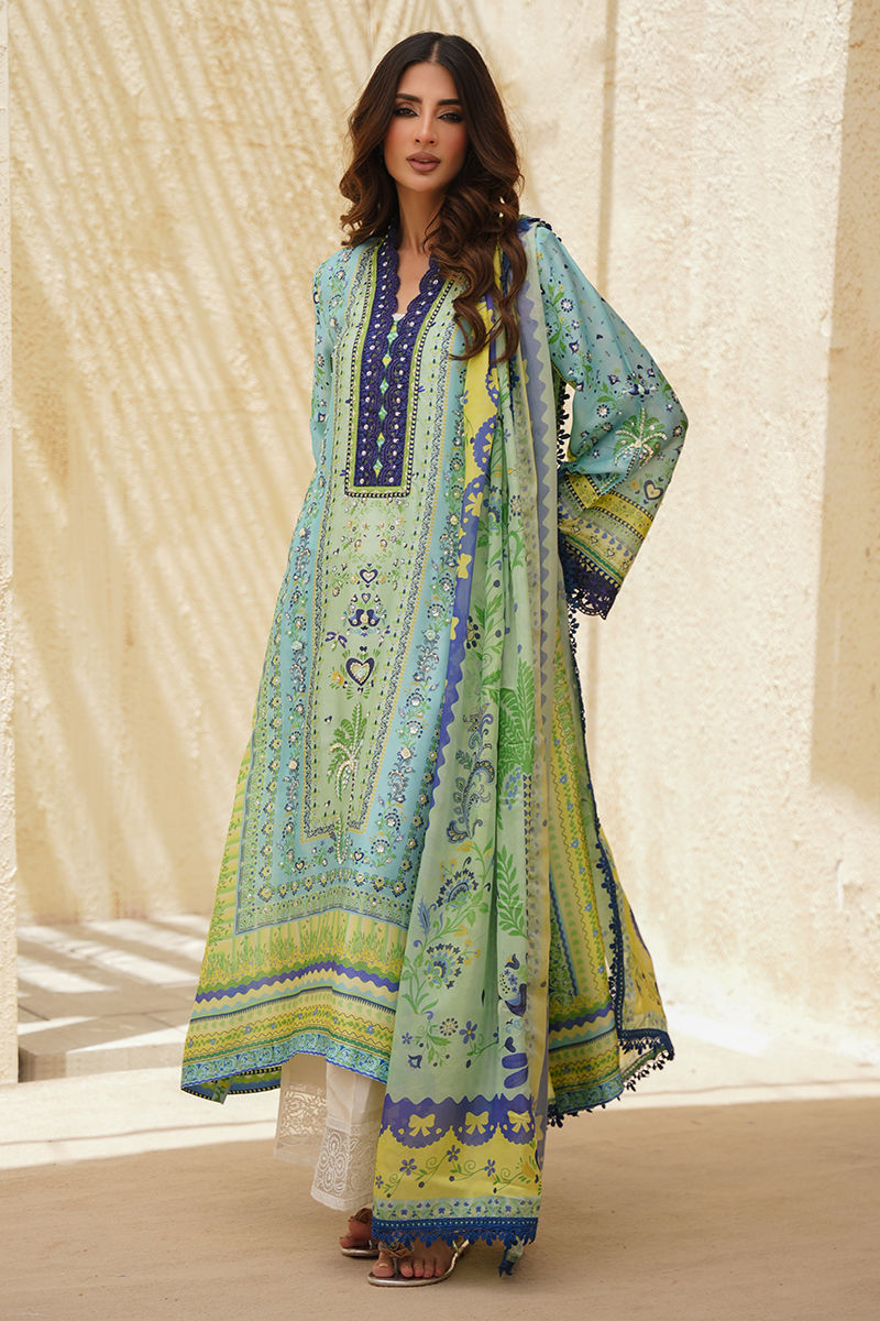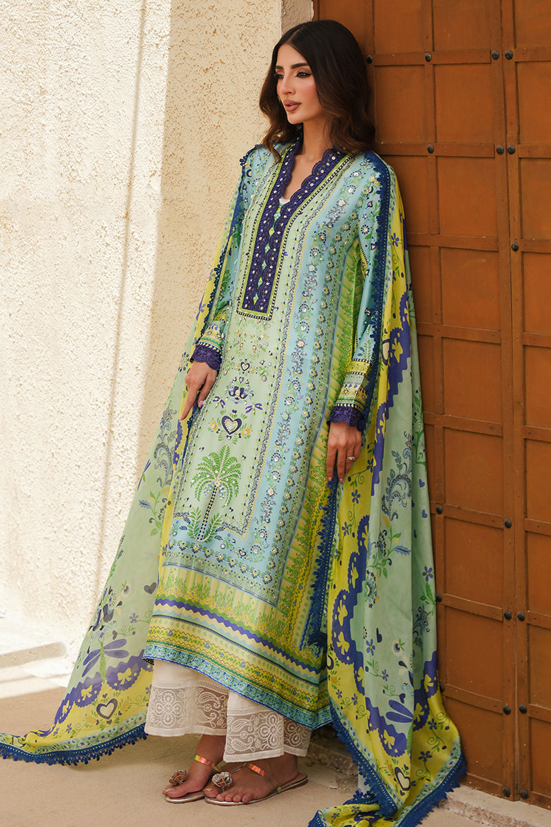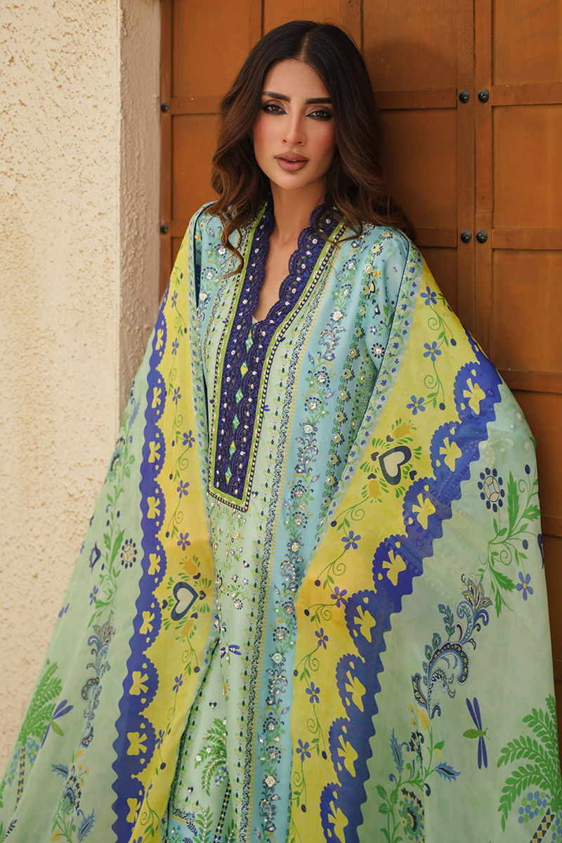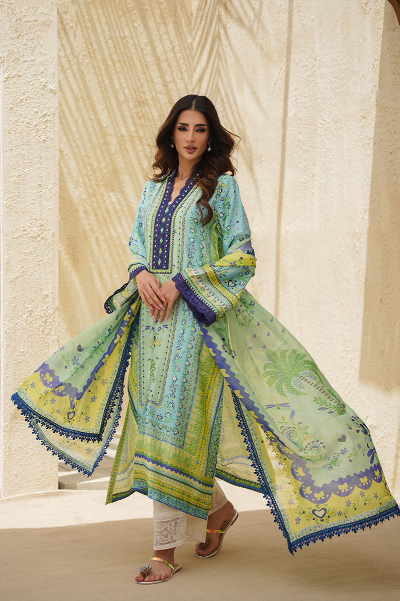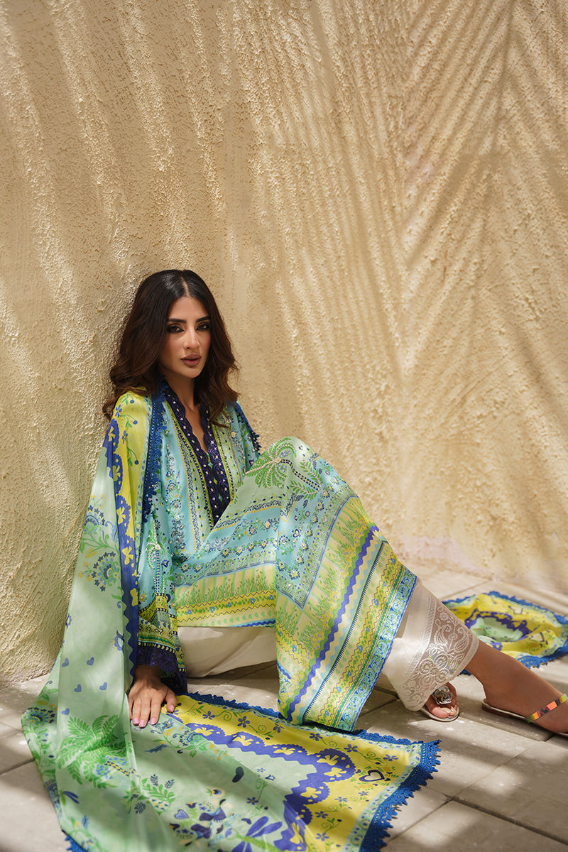 A vibrant silk ensemble brought to life with a playful blend of blue, lime, and yellow hues, featuring whimsical florals, palm trees, and charming heart accents across the print. Beautifully enhanced with shimmering crystal stones and delicate 3D floral embellishments, this design radiates freshness and statement elegance. Paired with a beautifully coordinated silk printed dupatta finished with delicate lace and complemented by ivory pants, this look is a perfect fusion of artistic luxury and contemporary sophistication. Model is wearing an add on slip