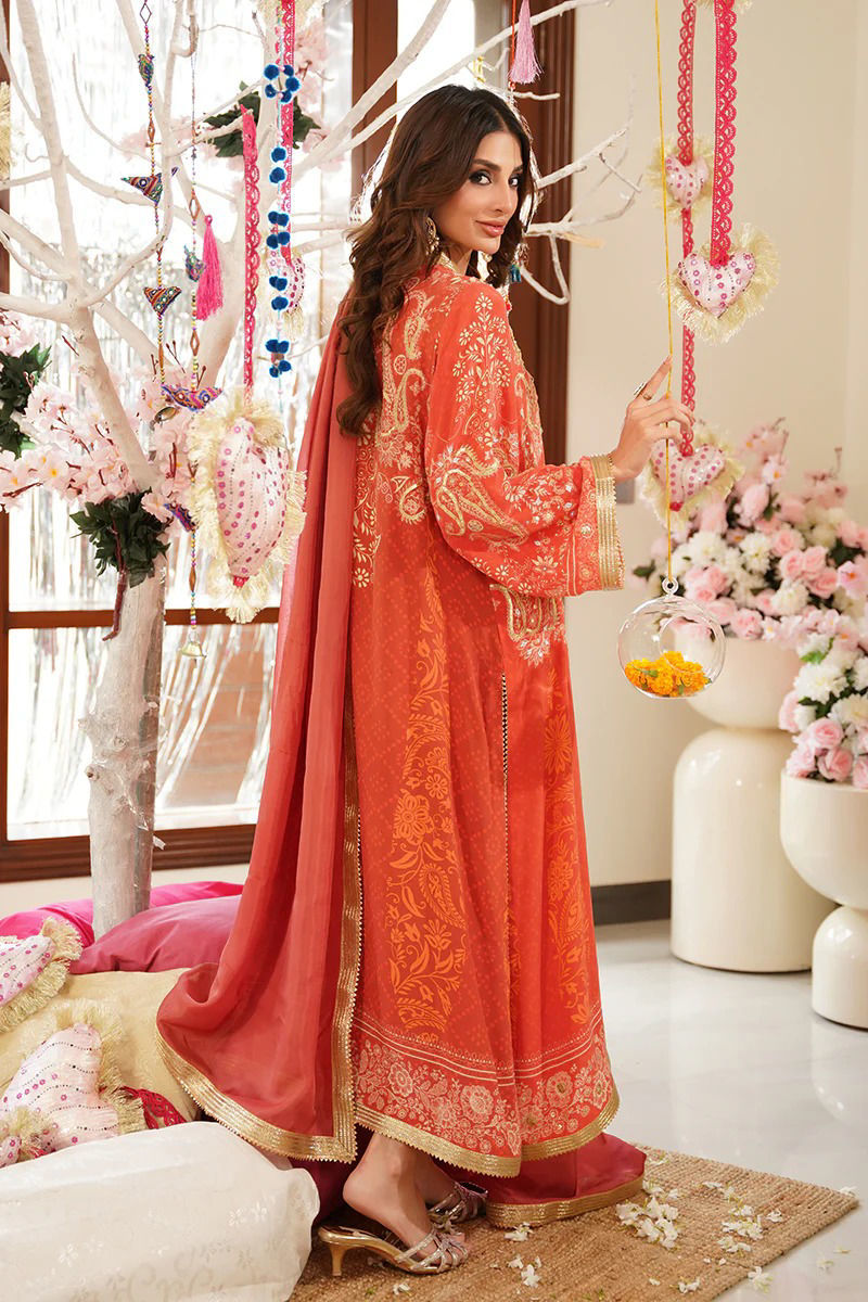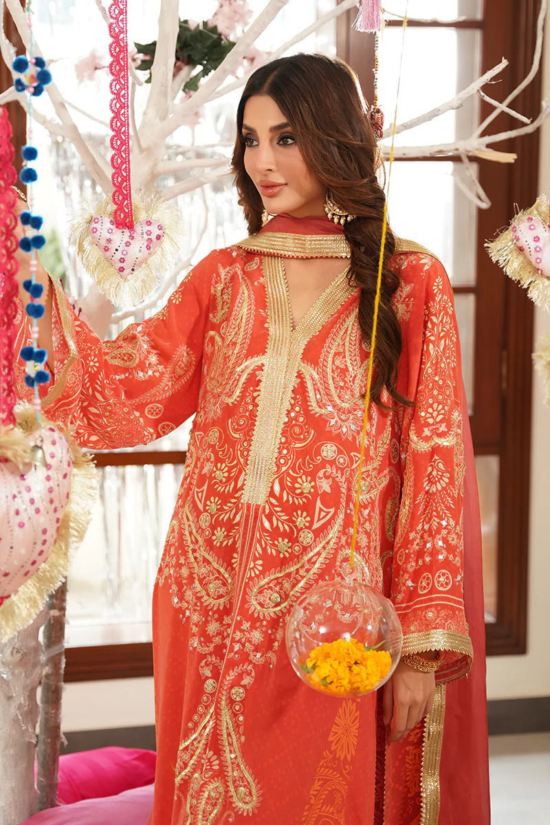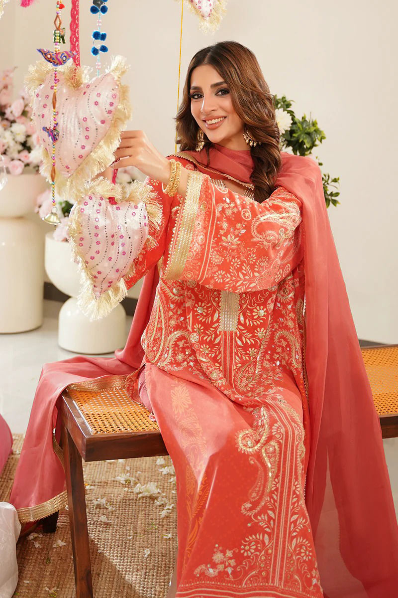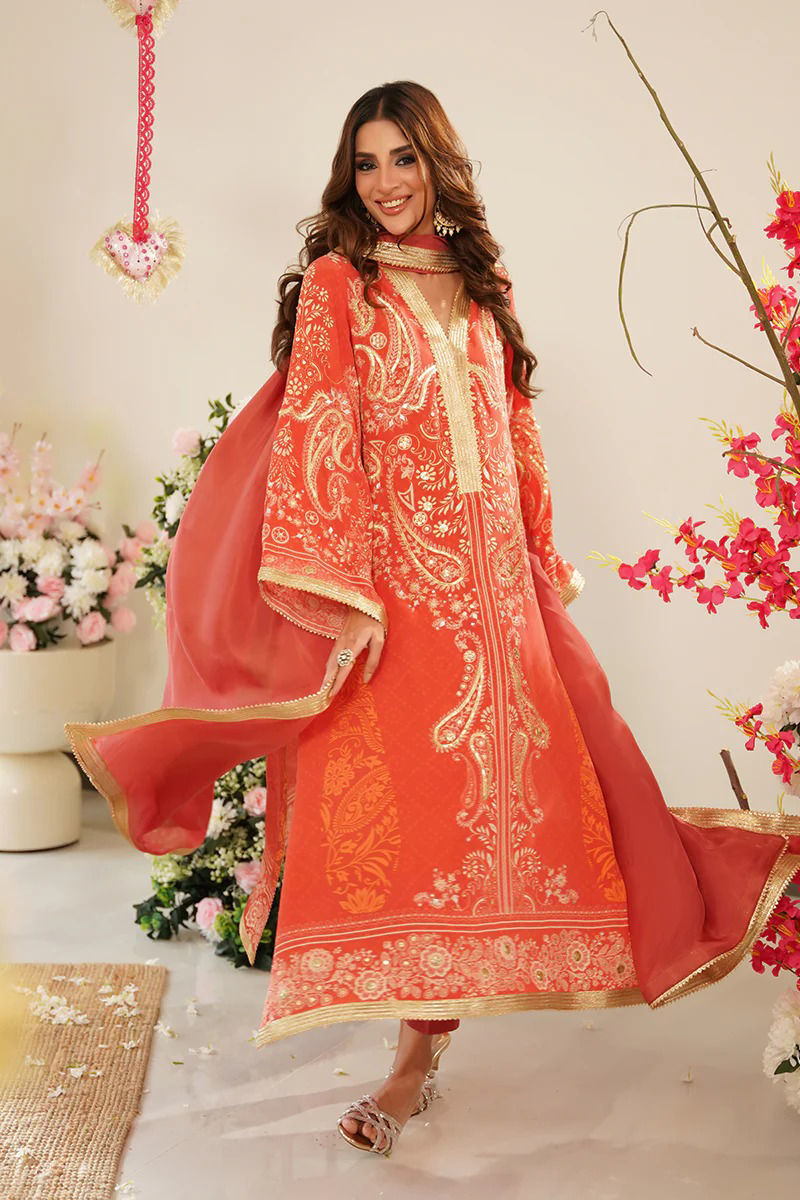 A bold statement in tomato red, this pure crepe ensemble features an artistic fusion of traditional paisleys with a modern layout, creating a vibrant and contemporary look. The design is tastefully enhanced with gold dori and gota embellishments, adding a touch of festive sparkle and refined detailing. It is paired with a tissue silk dupatta, finished with delicate gota accents that complement the shirt's embellishments beautifully.Shirt maximum length: 50Model height 5’8