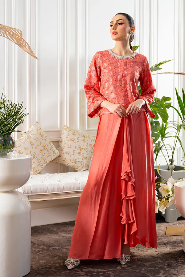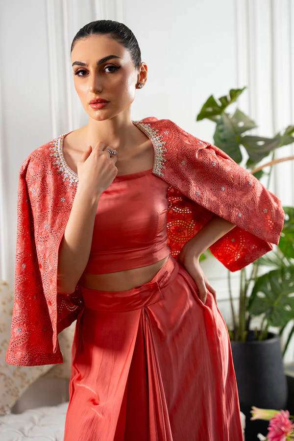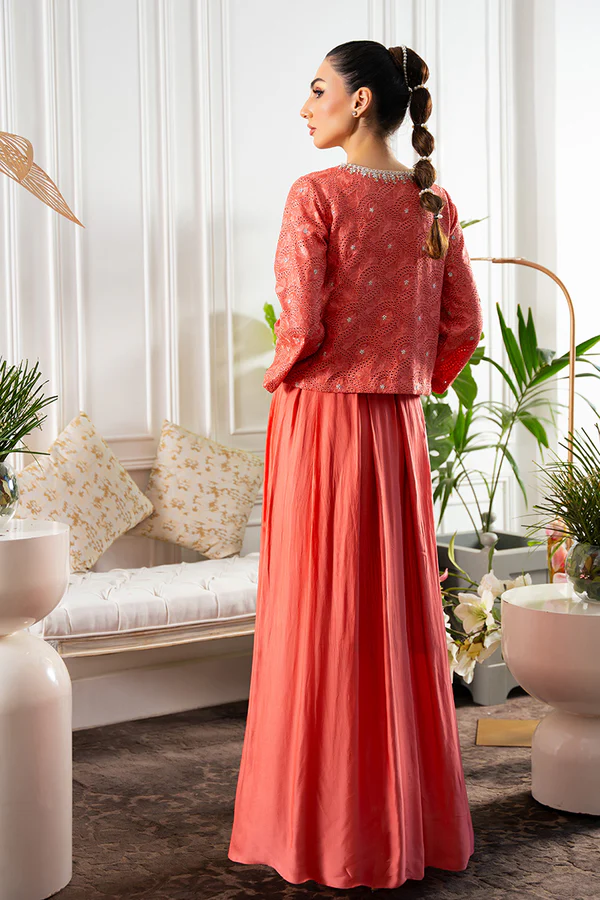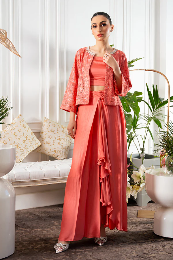 Summer soirées just got sorted in our Salmon coral pink shirt jacket in our in-house embroidered fabric is adorned with swarosvski crystals and hand work on the neckline. Pleated silk skirt and plain blouse compliments the otherwise Uber chic jacket.