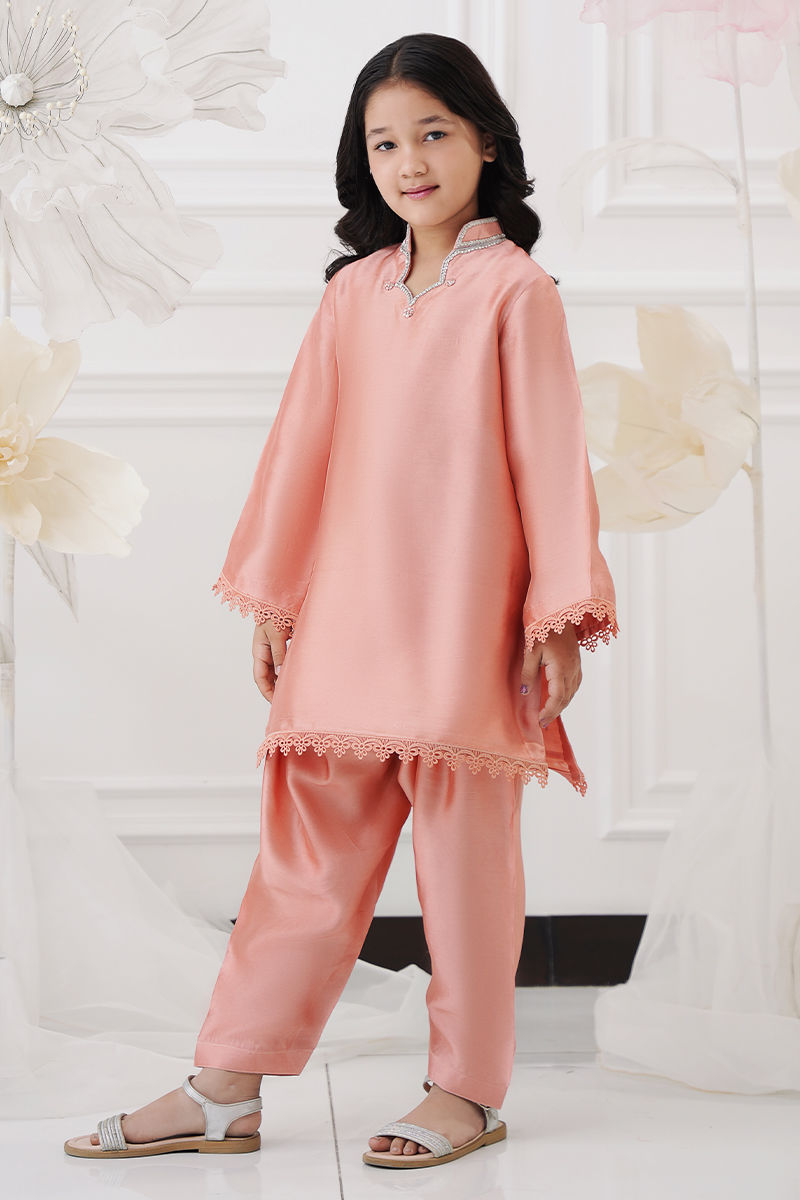 A charming mini me version of the ensemble, featuring a sheesha silk shirt paired with matching shalwar. The neckline is delicately adorned with resham embroidery and sparkling Swarovski crystals, adding a touch of elegance and shimmer. Perfectly sized for little ones, this outfit brings a sweet yet sophisticated charm to coordinated looks.