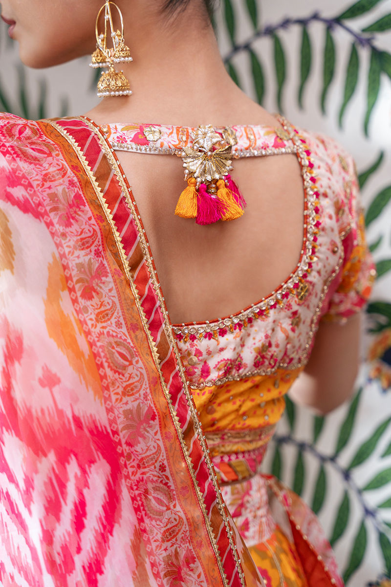 Make a statement in this stunning ivory ensemble, where traditional artistry meets contemporary style. Featuring an exquisite ikat print with accents of pink and yellow, this outfit is adorned with intricate handwork of sequins, stones, kora, dabka, resham, and moti, creating a dazzling effect that graces the Choli, and lehnga. The outfit is paired with a flowing lehenga that adds volume and grace, while the printed organza dupatta, with its dazzling tassels, completes the look with an ethereal charm. Style it with statement jewelry and heels for a look that captures attention and exudes timeless elegance. Lehenga: Raw Silk Choli: Raw Silk Dupatta: Organza