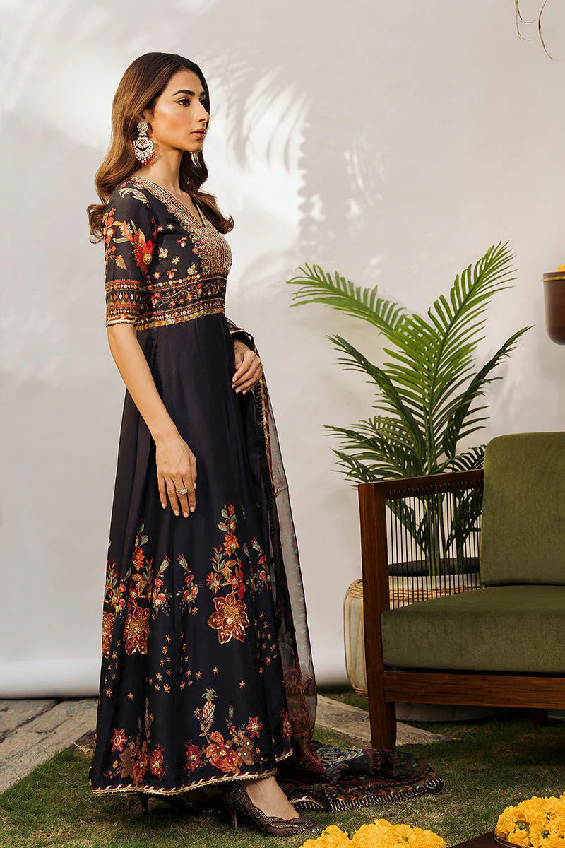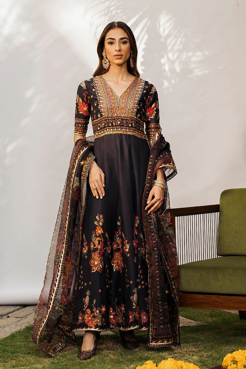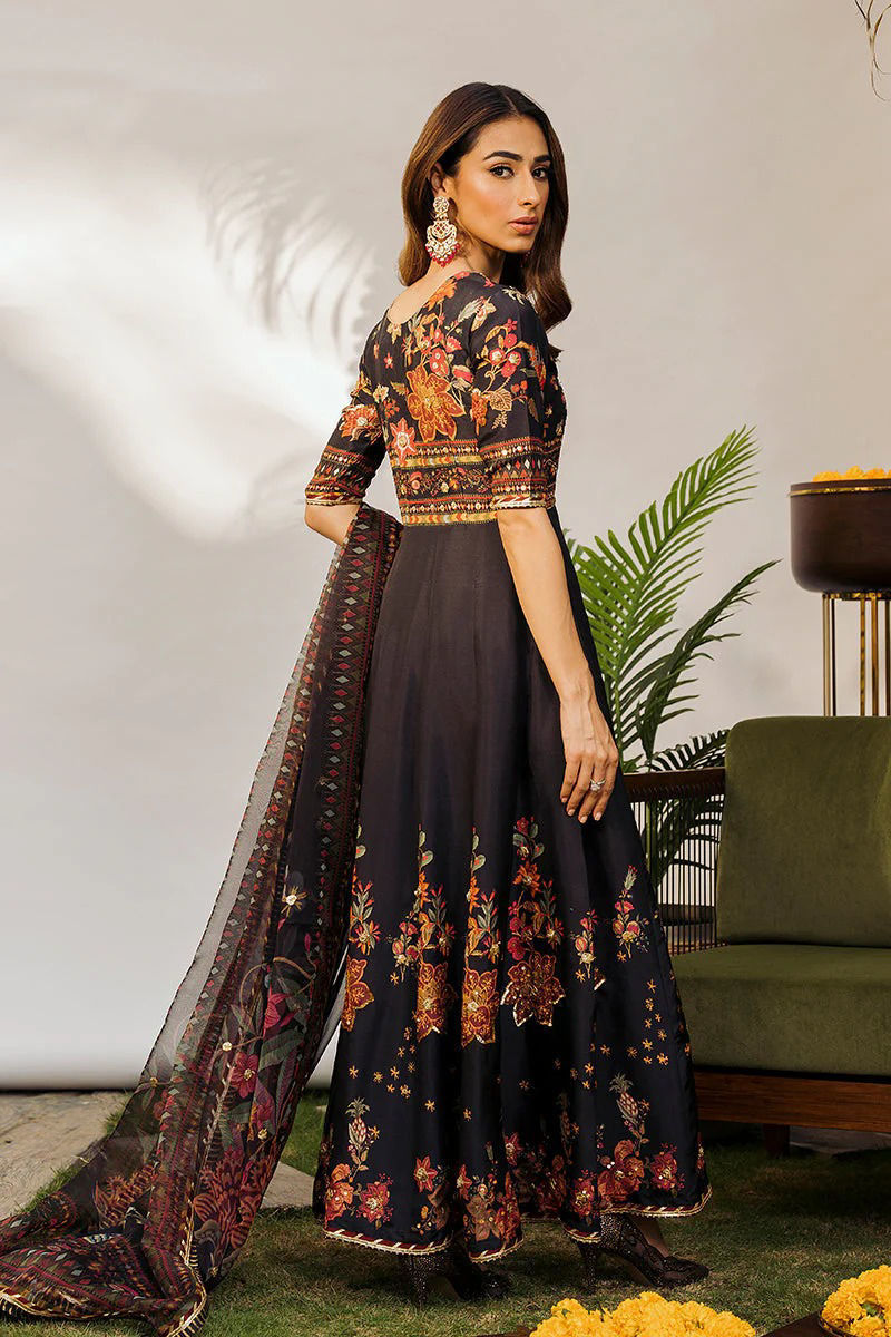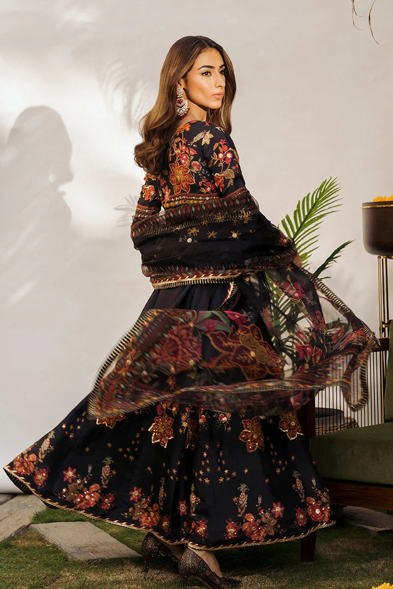 Classic black pure rawsilk Peshwas on our in-house floral print is chic and perfect For dholkis and can be repped from intimate gatherings or styled up for a luxurious mehndi look. An amalgamation of Dori, sequence, kora dabka it’s a true stellar. Printed organza dupatta completes the whole outfit with minimal detailing of chatapatti. Pure Rawsilk Pants comes as Add On. *It Includes Shirt & Dupatta.