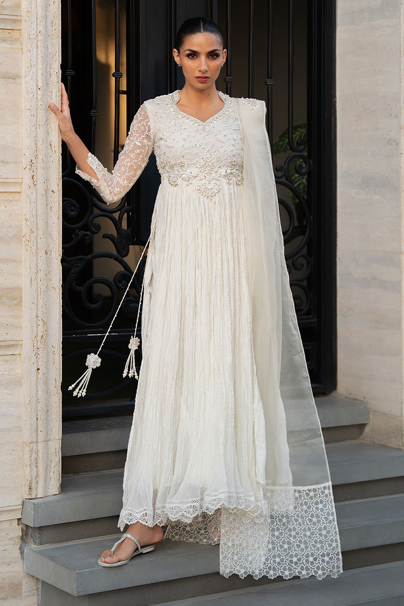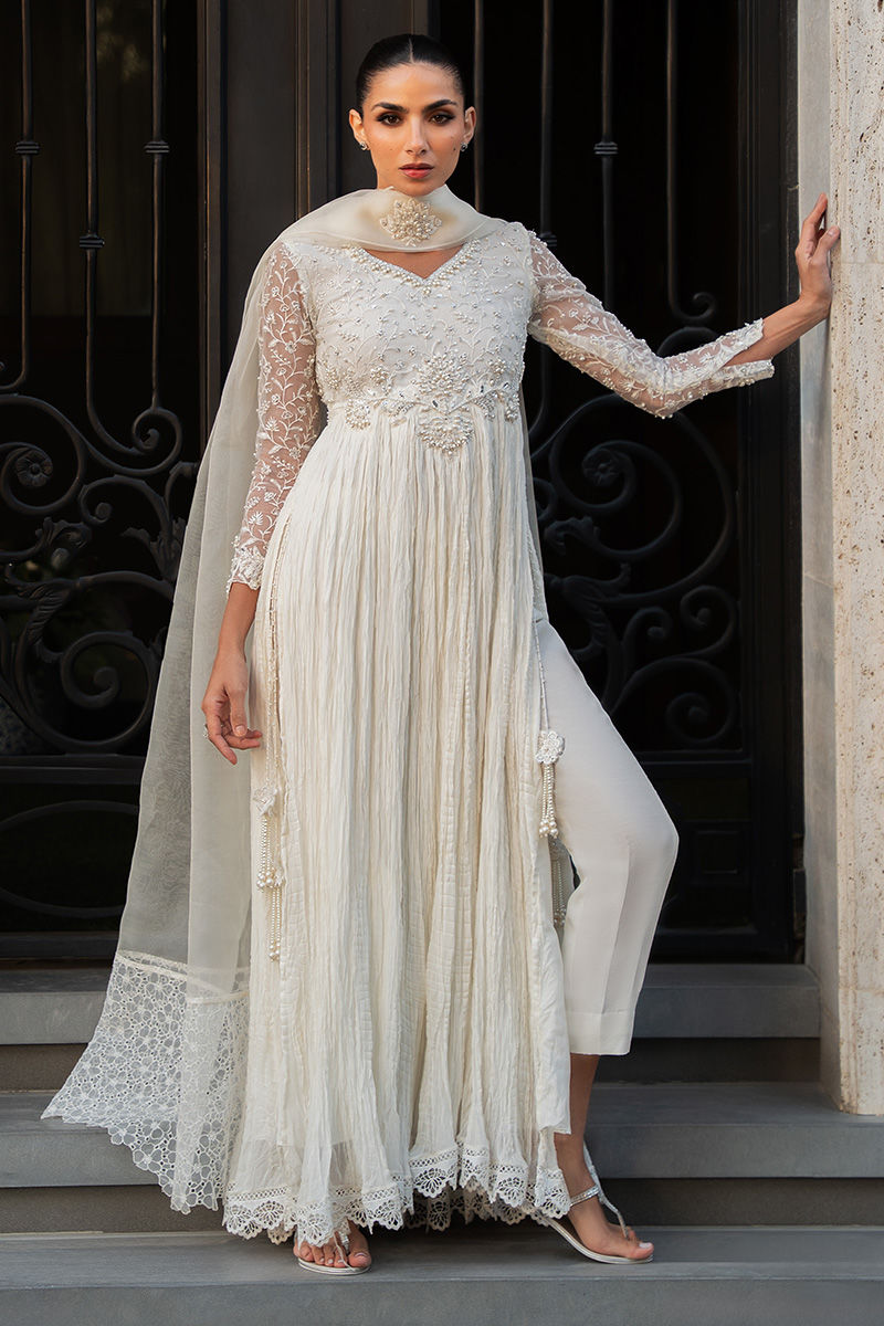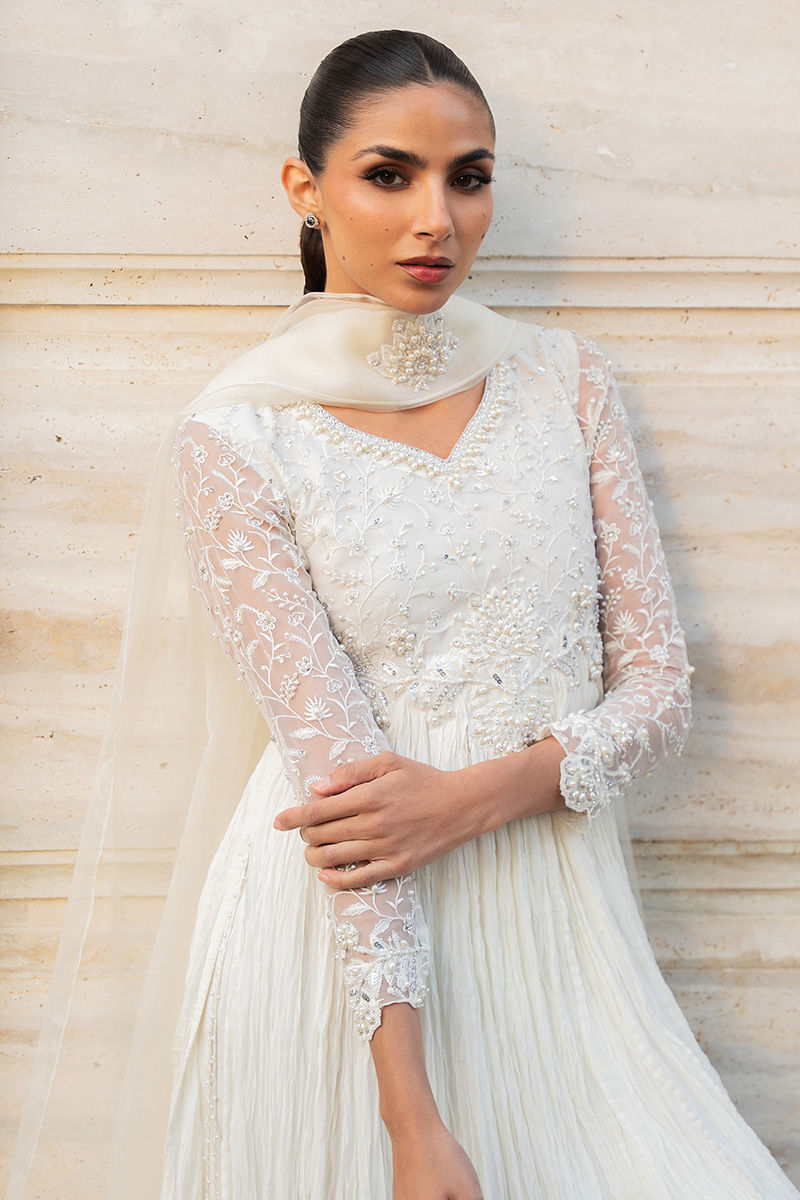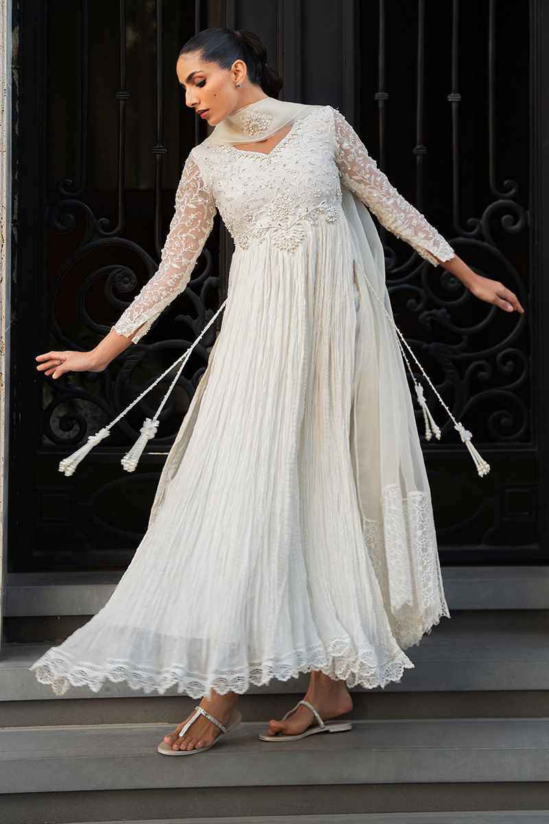 A regal ivory pishwas featuring an in-house embroidered fabric bodice and sleeves, richly adorned with pearls, sequins, crystals, and a delicately cutout hem. The flared silhouette is crafted in crushed chiffon for graceful movement, while statement tassels accent the side slits. An organza pleated dupatta, finished with in-house floral embroidered silk on the pallus, completes the ensemble, paired with straight pants as an elegant add-on. Model is wearing 57" length