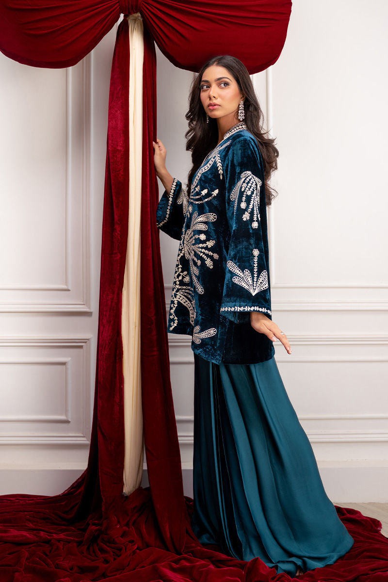 A deep blue velvet short shirt adorned with intricate aari embroidery, enhanced with a subtle sparkle of Swarovski crystals for added shine. Paired with a pleated dhoti skirt, this ensemble blends classic craftsmanship with contemporary elegance — perfect for festive and formal occasions. Shirt Length: 30'' Model Height: 5'8