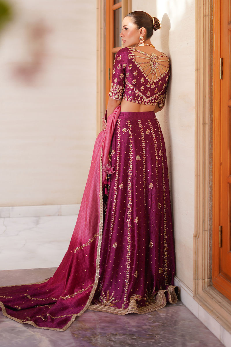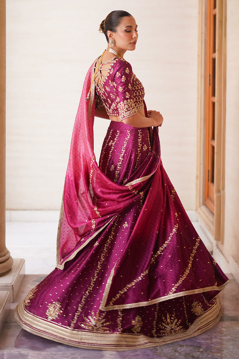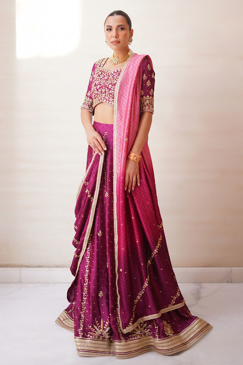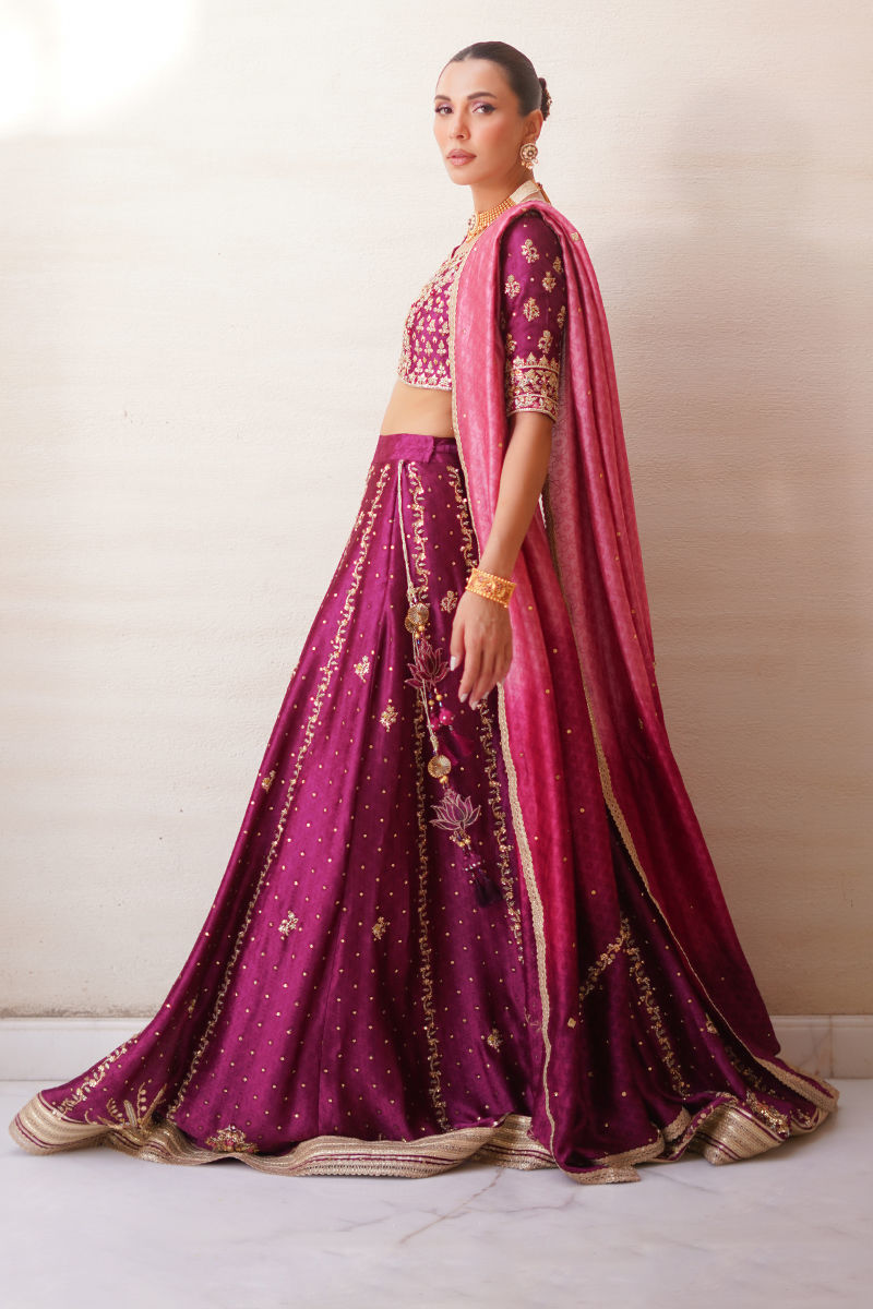 An exquisite creation, this plum lehenga choli is crafted in sheesha silk, radiating a lustrous elegance. The choli lehenga are beautifully adorned with intricate handwork of dabka, gota, sitara, and resham, finished with delicate gota accents and tassel detailing on the lehenga for a regal touch. Paired with an ombre three-toned dupatta, embellished with matching handwork and refined lace finishings, the ensemble strikes the perfect balance between grandeur and finesse. A timeless silhouette reimagined with artisanal mastery, making it a true statement bridal look. Lehenga: Sheesha Silk Choli: Sheesha Silk Dupatta: Sheesha Silk