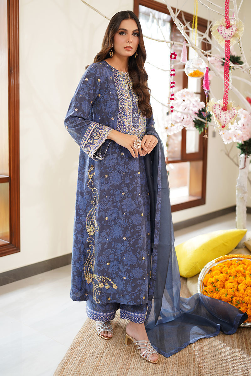 A timeless statement in shades of blue, this outfit is crafted from pure raw silk with an intricate self-print that adds depth and texture. The shirt features a beautifully detailed neckline, adorned with exquisite hand embellishments using kora, dabka, and Swarovski stones — extending gracefully along the side slits for a luxurious finish. The matching izaar, tailored in the same self-printed raw silk, ensures a cohesive and elevated silhouette. Pair it with the optional organza dupatta, finished with printed borders, for an added layer of elegance and sophistication. A perfect blend of classic craftsmanship and modern design. Shirt maximum length: 52 Model height 5’11 Shirt: Pure Raw Silk Dupatta: Organza Pant: Pure Raw Silk