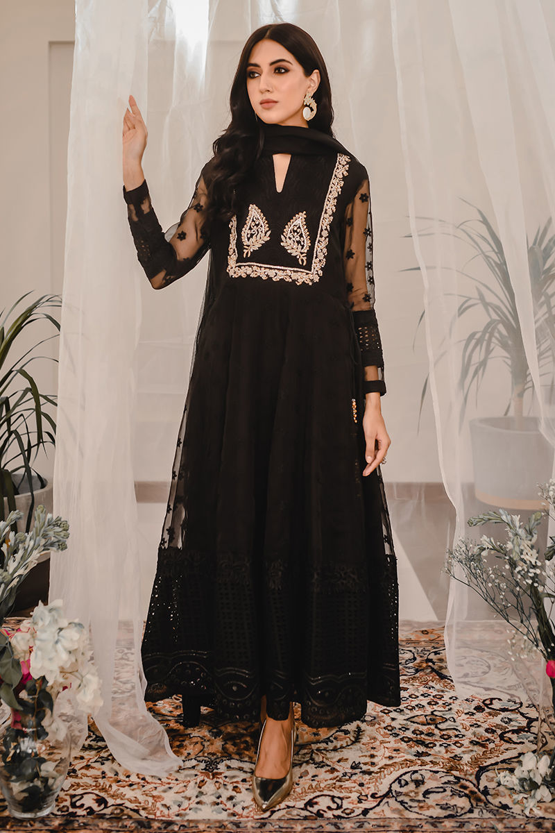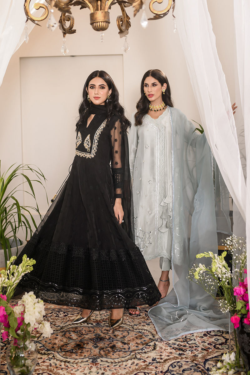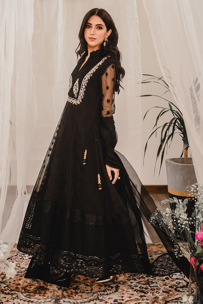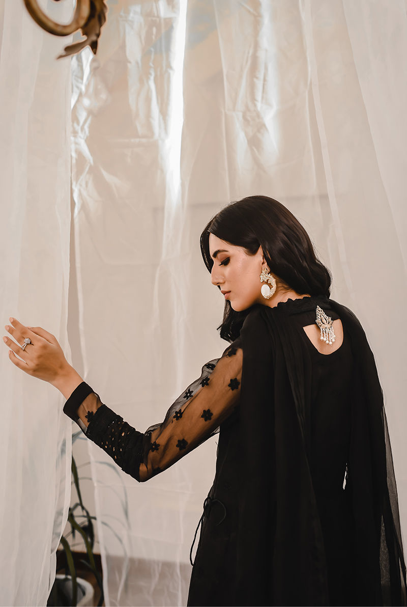 SEASON’S MUST HAVE - A classic black kalidar in fully embroidered organza. Lilya design is played around with a range of fabrics, laces, and embroideries to make it drool-worthy. The bodice is fully handworked with zardozi, making it fit for any intimate occasion. Paired with an organza dupatta with lace and schiffli detailing. Pair it with our signature pants to complete the look. *It comes with a organza dupatta.