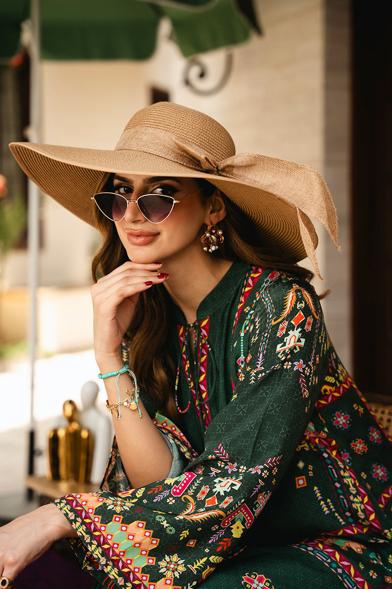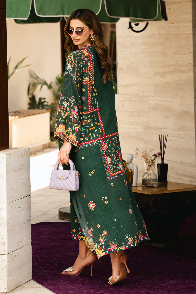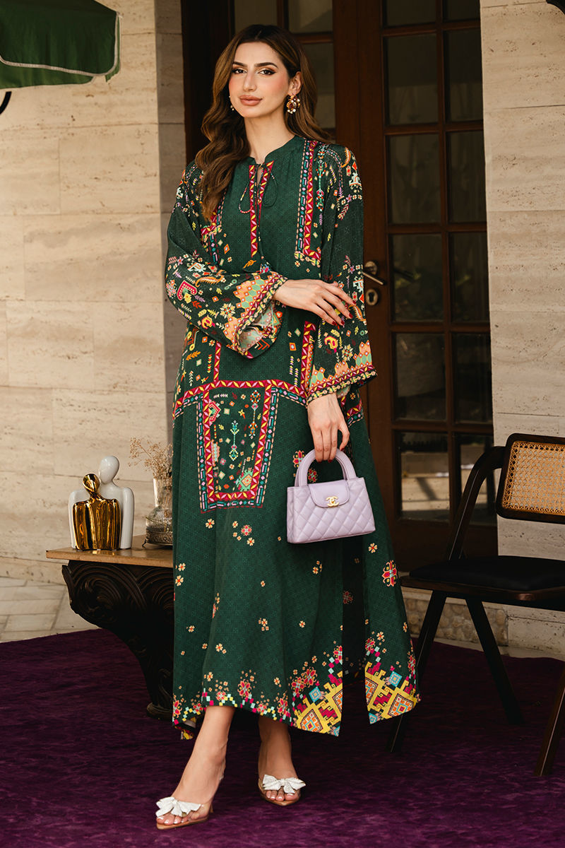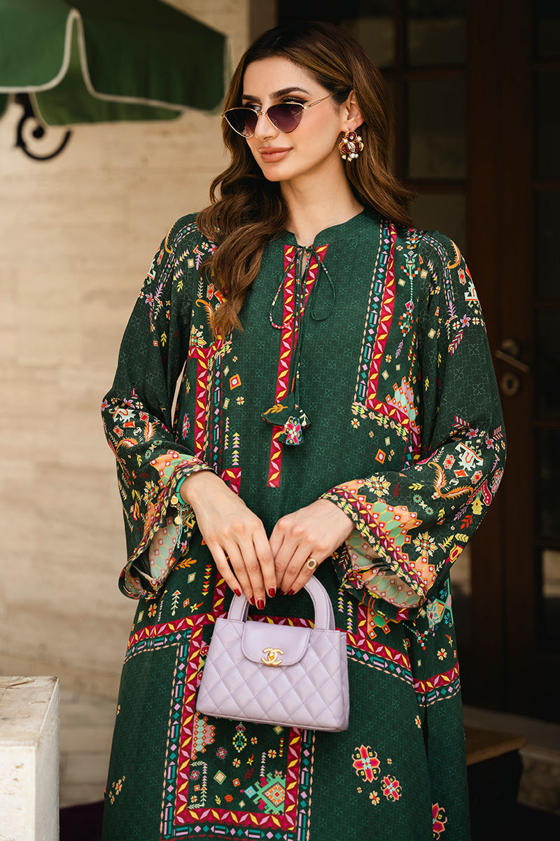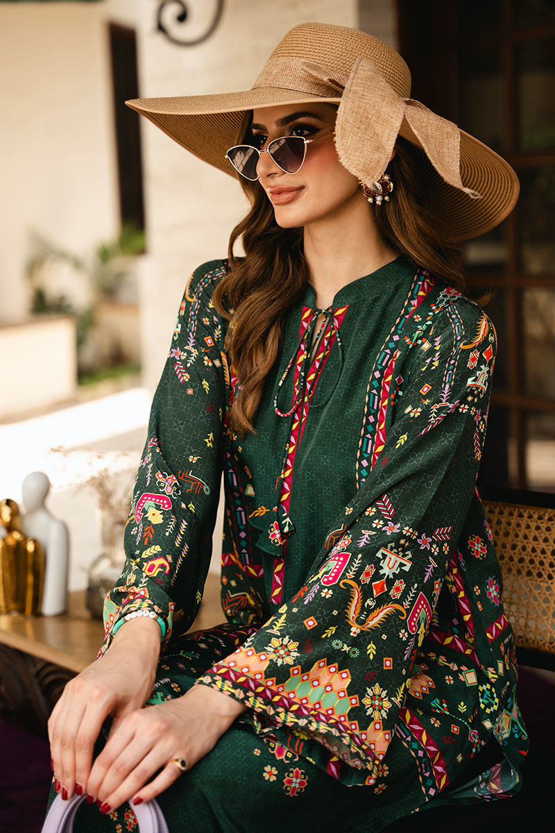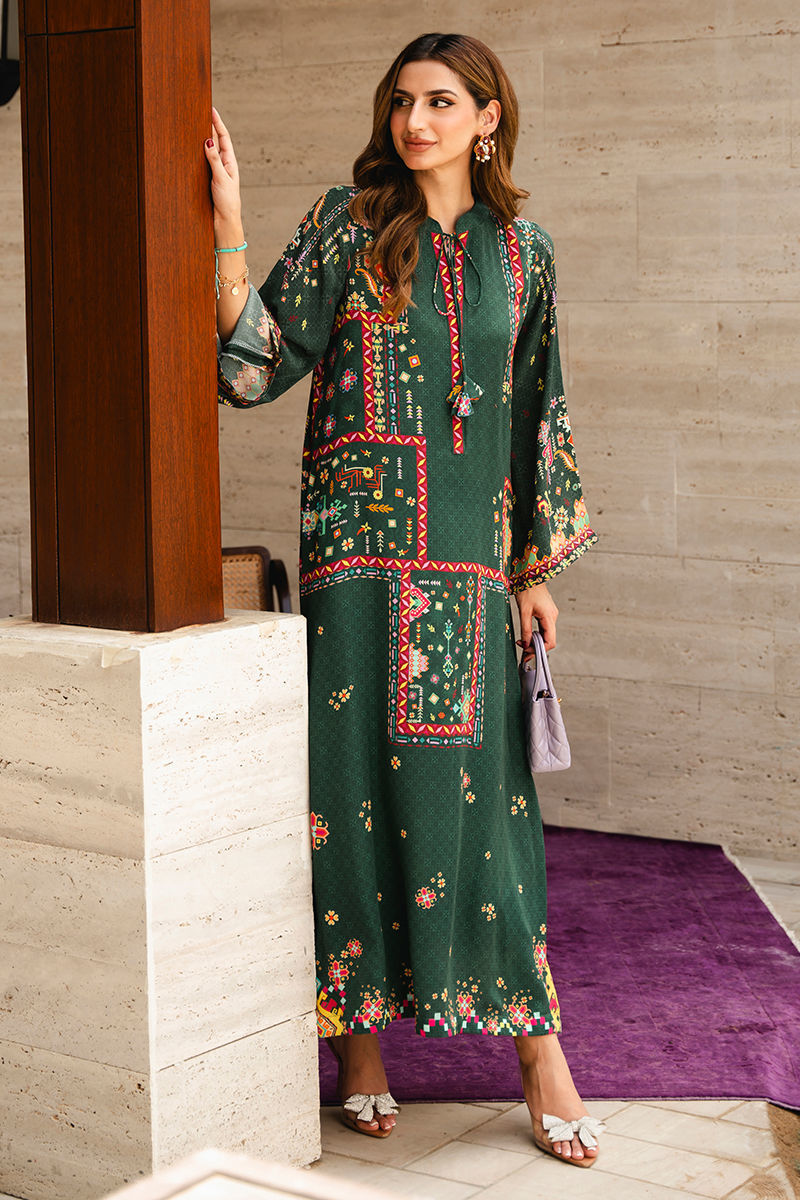 Discover effortless sophistication with this deep green crepe kaftan kurta, designed to captivate with its intricate textile print. The kaftan features a rich deep green hue adorned with a sophisticated blend of linear elements, florals, and geometric patterns, creating a visually dynamic yet harmonious design. The crepe fabric’s luxurious drape enhances the kaftan's flowing silhouette, providing both comfort and elegance. Paired with the kaftan are pure raw silk pants in a complementary deep green shade, which add a touch of opulence and complete the ensemble with a polished, cohesive look. Styling tip: you prefer something more functional, choose a chic crossbody bag in a neutral shade like beige, cream, or metallic. Shirt: Crepe Silk