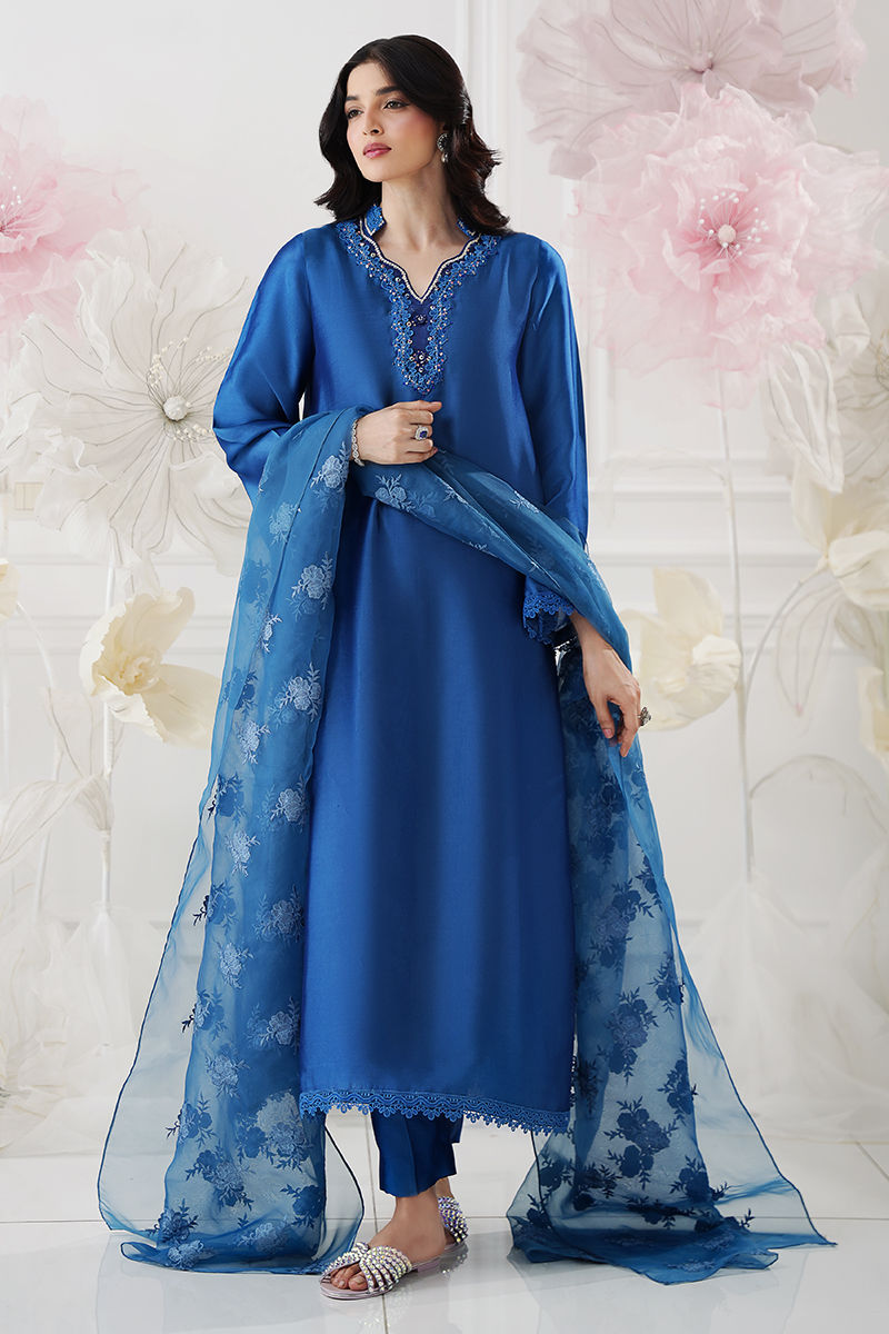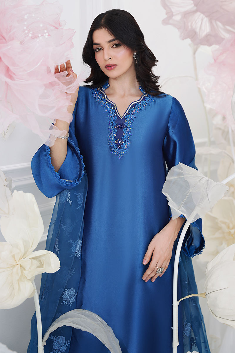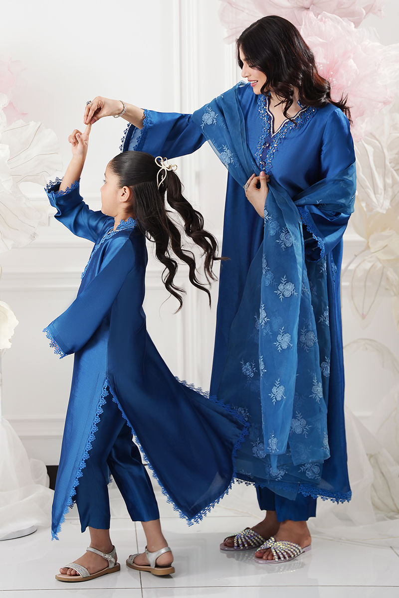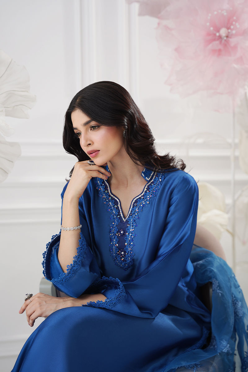 A serene blue sheesha silk shirt, elevated with intricate cutwork lace detailing along the side slits. The neckline is delicately adorned with fine embellishments that add a subtle shimmer without overpowering the look. Pair it with a gracefully embroidered organza dupatta that lends an airy, ethereal finish, available as an add-on for a perfectly coordinated statement.The ensemble is completed with a matching sheesha silk pant. Model height 5'8, shirt length : 50