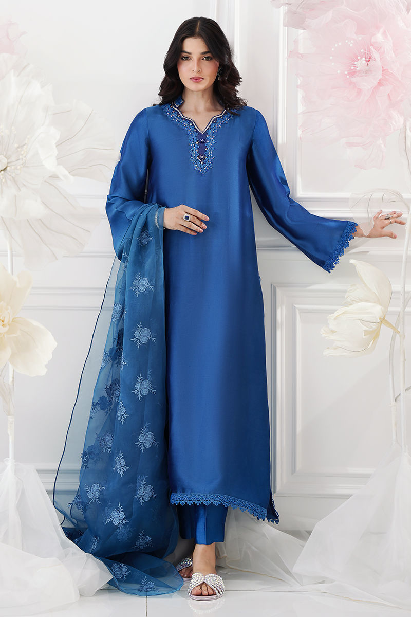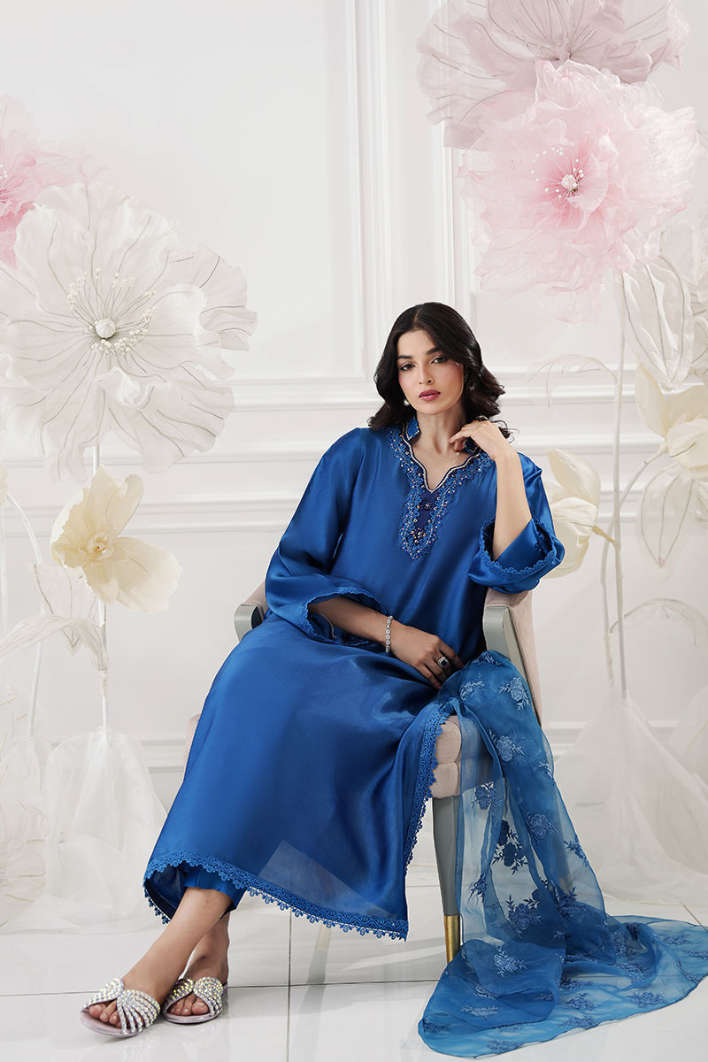 A serene blue sheesha silk shirt, elevated with intricate cutwork lace detailing along the side slits. The neckline is delicately adorned with fine embellishments that add a subtle shimmer without overpowering the look. Pair it with a gracefully embroidered organza dupatta that lends an airy, ethereal finish, available as an add-on for a perfectly coordinated statement.The ensemble is completed with a matching sheesha silk pant. Model height 5'8, shirt length : 50