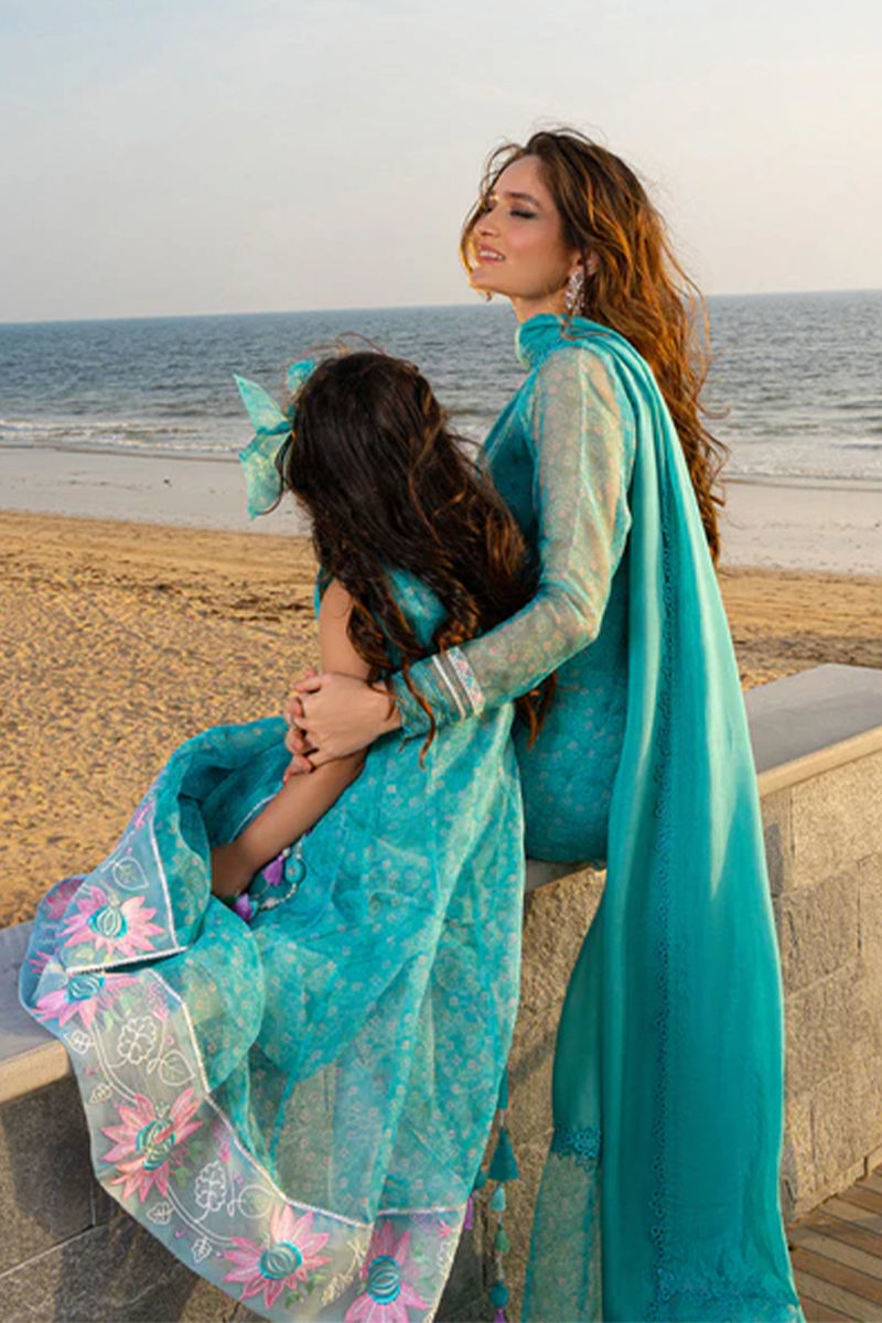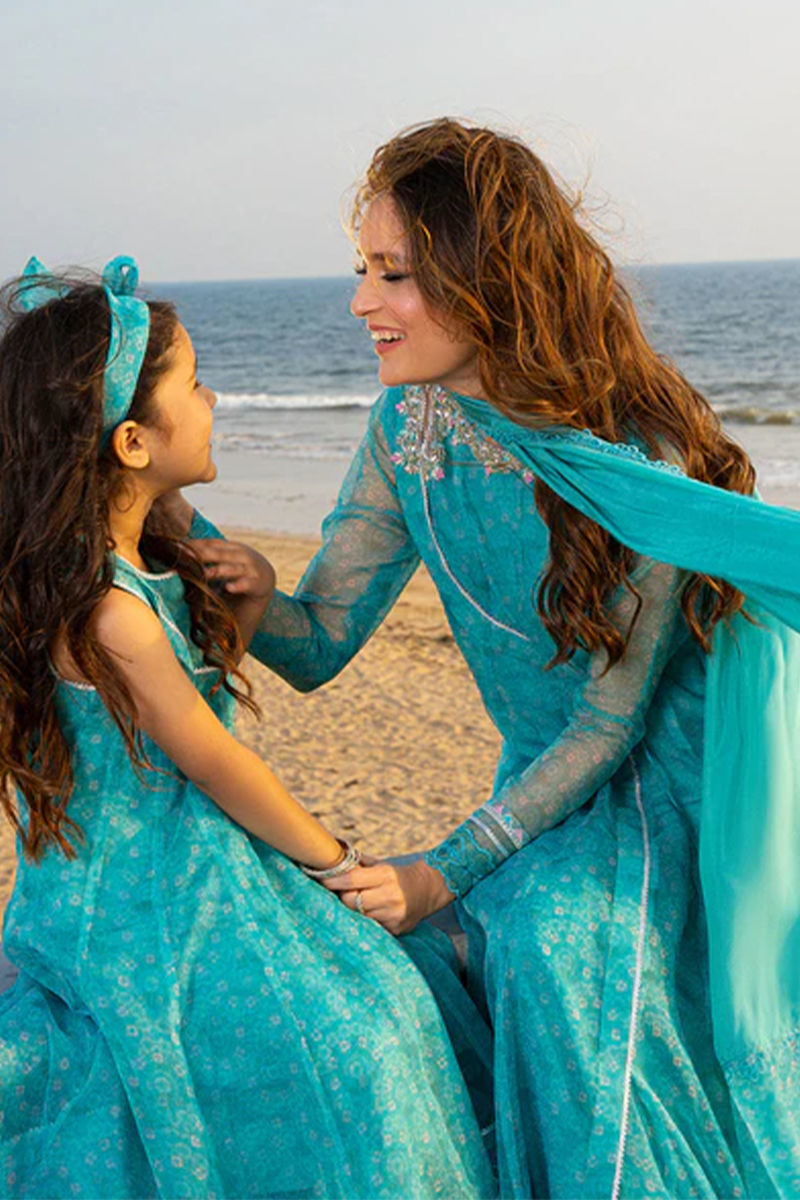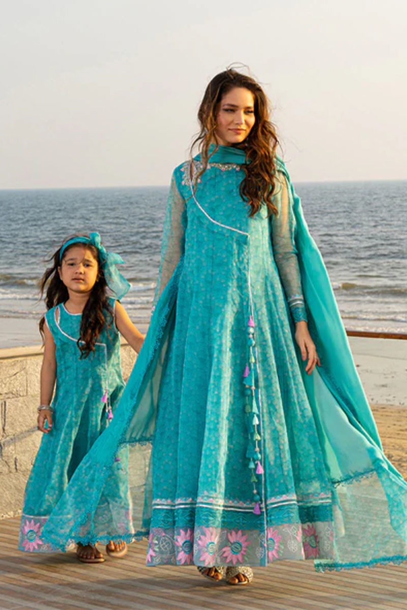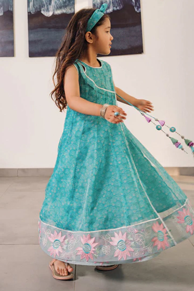 Super festive mini me aqua blue printed angrakha with kingri detailing. embroideries on flair and inhouse cute tassles. Twirl around and style your girlies this season in this outfit. Pants are on silkShirt: OrganzaPant: Organza