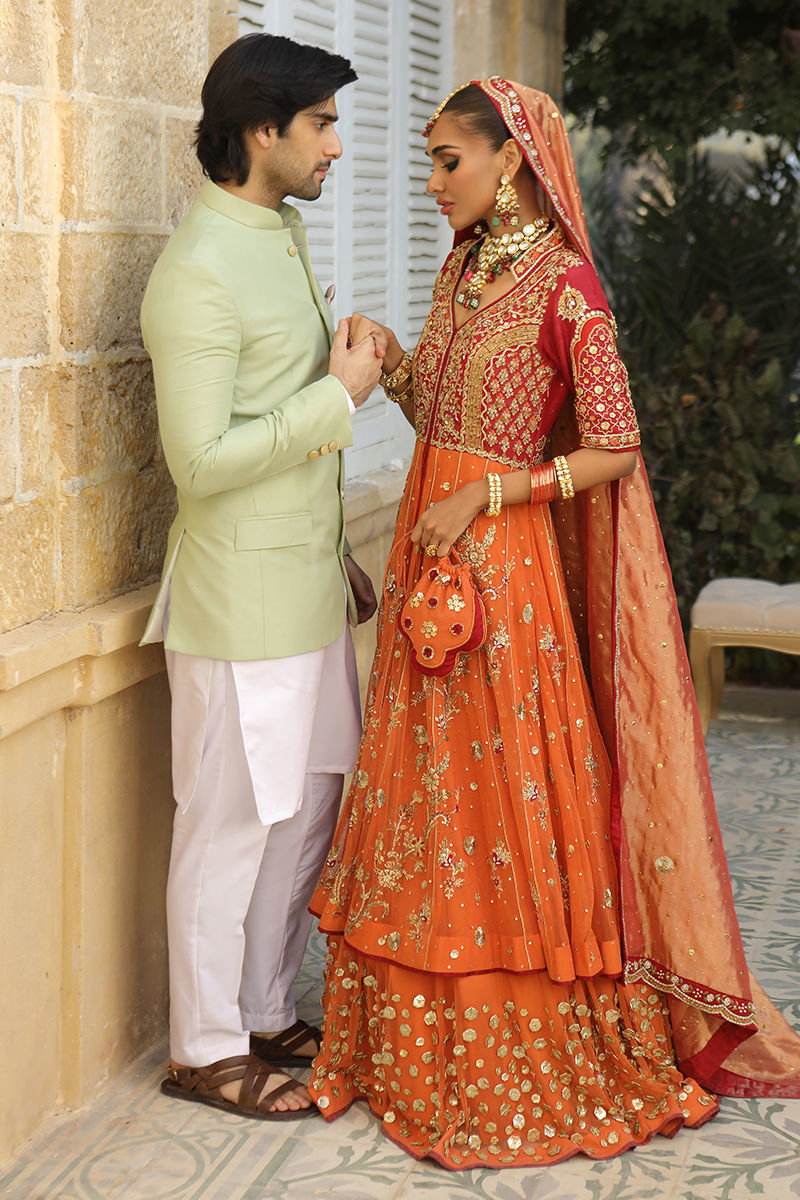 A traditional vibrant tone of burnt orange kalidar with pure raw silk crimson bodice . The kalidar is perfect for a mehndi bride . It is fully handworked with signature Amna Arshad details with kora dabka sprinkled with Indian gota .and a luxurious pure tissue dupatta complements the whole look., Fully loaded with kamdani bootiies and 4 sided hand worked border duppata. Ooh The back is just enough to turn heads around . The peshwas can be paired with our classic pants and gota worked pouch. Designer’s note : Pair your grandma’s jhumkas and choker to be the most beautiful AA mehndi bride!