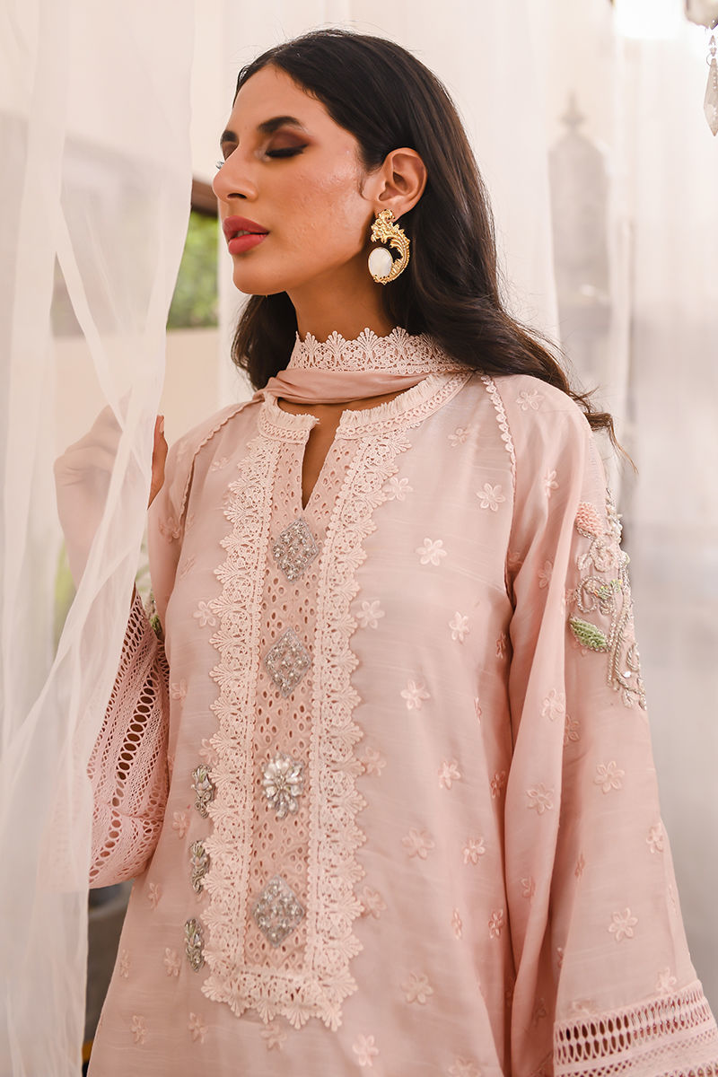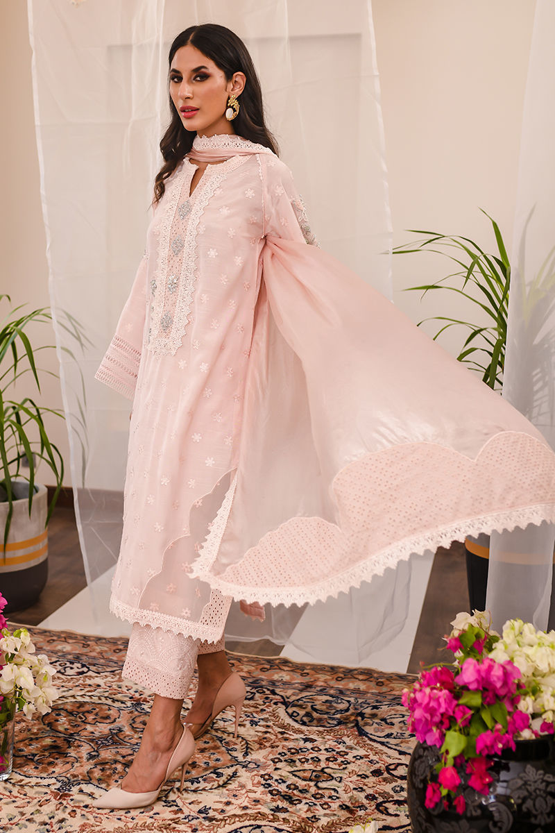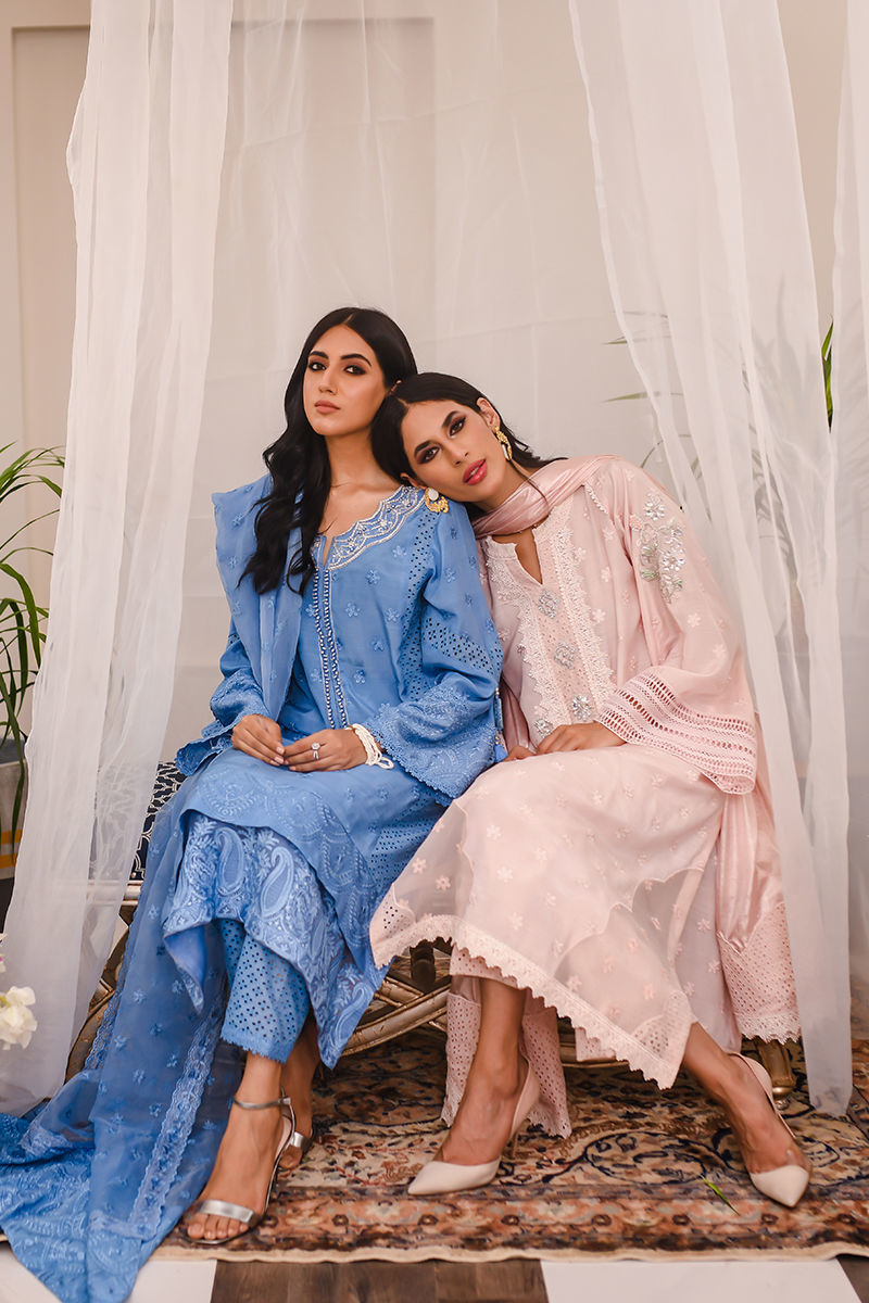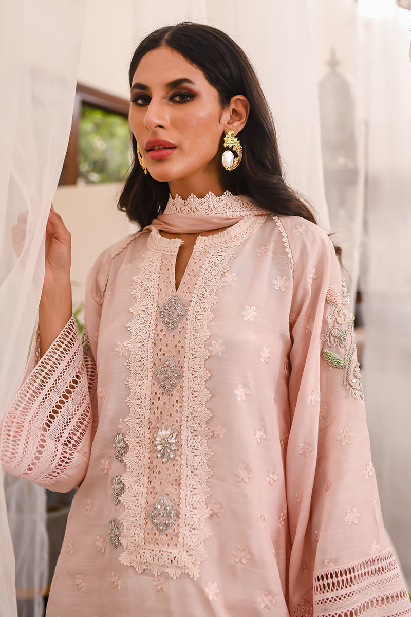 A forever flattering silhouette in an easy-breezy fabric with handwork detailing on neckline and sleeves encrusted in pearls, zardozi and French knots. Oversized sleeves with handwork motif and cutwork lace make it a perfect summer outfit. The hemline is appliquéd with Chikan and organza detailing. It is paired with our signature pants and silk dupatta with Chikan appliqués and beautiful lace finishing.*It comes with a silk dupatta.Shirt: SilkDupatta: Silk